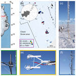 The established standard method for measuring turbulent fluxes is based on the eddy covariance (EC) technique (Swinbank1951; Mauder et al.2021). Wind and temperature fluctuations are typically measured at high temporal resolution (10–50 Hz) using a sonic anemometer, along with humidity variations using an open or closed path water vapour analyser. However, both suffer from limitations as open path analysers experience less attenuation than closed path analysers, but open path analysers are more sensitive to disturbances such as precipitation (Polonik et al.2019). The SHF and the LHF can be directly calculated as the covariance of vertical velocity fluctuations, and the corresponding temperature and humidity fluctuations, respectively. Yet, the considerable logistic requirements with respect to reliable (over-winter) power supply, supervision and maintenance, allow only rather limited deployments in remote areas under such extreme, polar meteorological conditions. Corresponding EC data sets for the ice sheet are therefore sparse (Van Tiggelen et al.2021, 2024) and generally limited to summertime deployments.