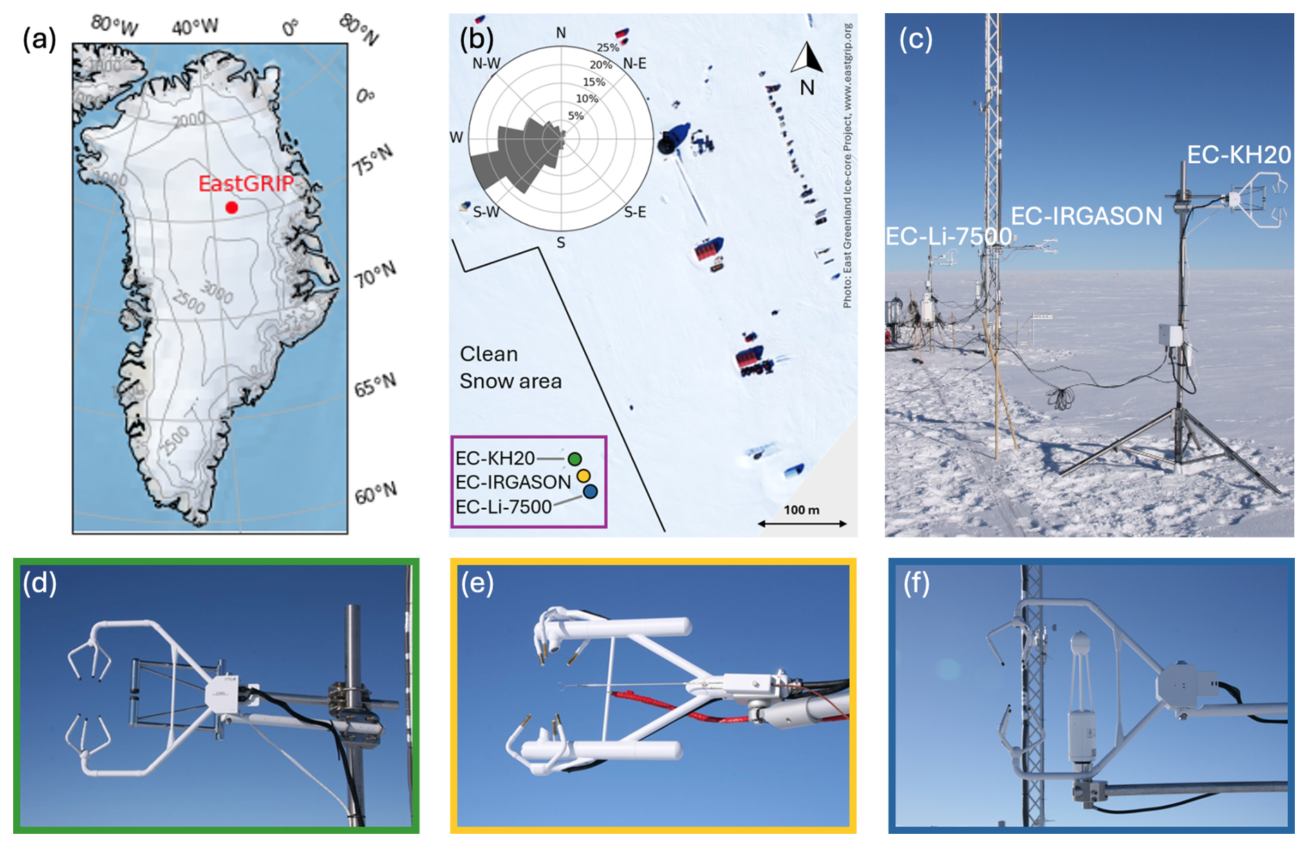 Figure 1(a) Location of the EastGRIP fieldsite on the Greenland Ice Sheet (75°3747′′ N, 35°5922′′ W), (b) camp overview with the location of the EC-systems in the dedicated clean snow area upwind of the camp along with the windrose during the campaign, (c) overview picture of the three individual EC systems oriented perpendicular to the prevailing wind direction, and detailed views of the individual EC setups (d) CSAT3+KH20 (EC-KH20), (e) IRGASON (EC-IRGASON), (f) CSAT3+Li-7500 (EC-Li-7500). Surface elevation in Fig. 1a is from Morlighem et al. (2017). The footprint of the EC-Irgason is provided in Sect. S1 in the Supplement.