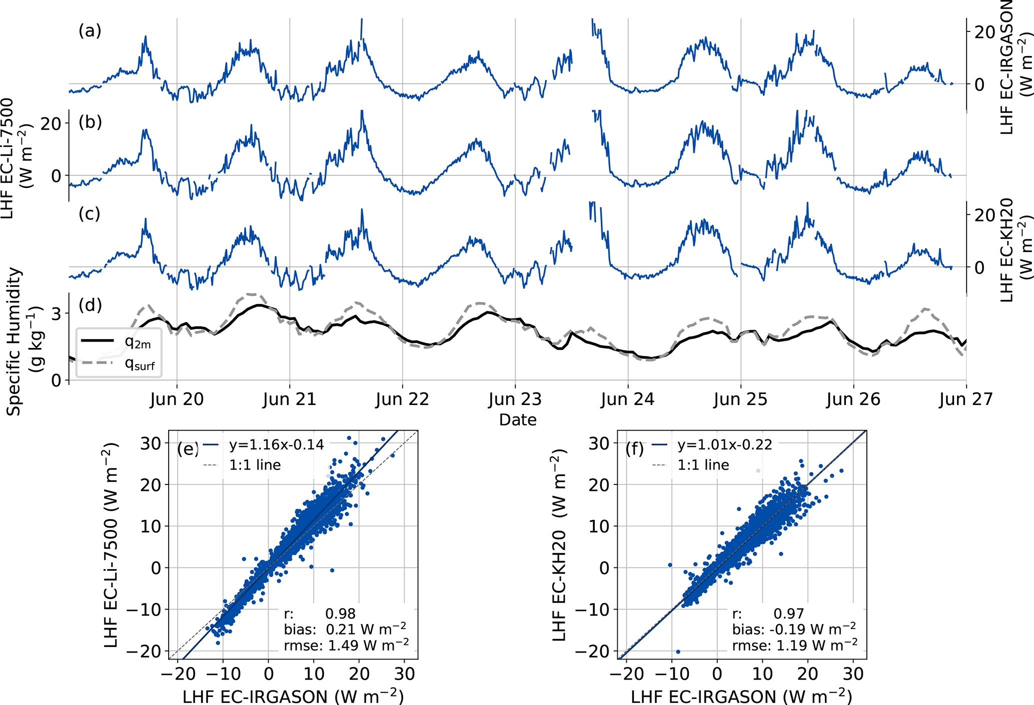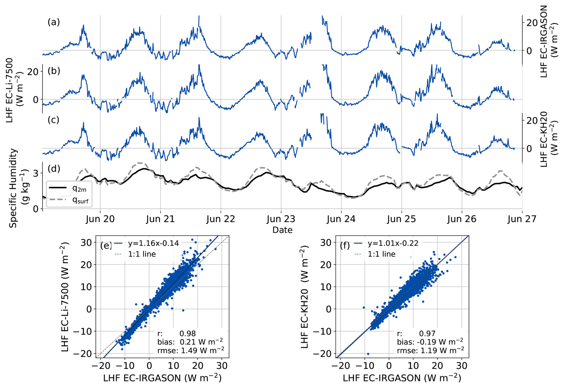 Figure 2Examples of time series of the LHF measured by (a) the EC-IRGASON, (b) EC-Li-7500 and (c) EC-KH20 and (d) the specific humidity at 2 m and at the surface based on PROMICE AWS measurements. Direct comparisons of the LHF during the entire campaign measured by the EC-Li-7500 and EC-KH20 versus EC-IRGASON are shown in panels (e) and (f). The EC and AWS data have a 10 min and hourly temporal resolution, respectively.