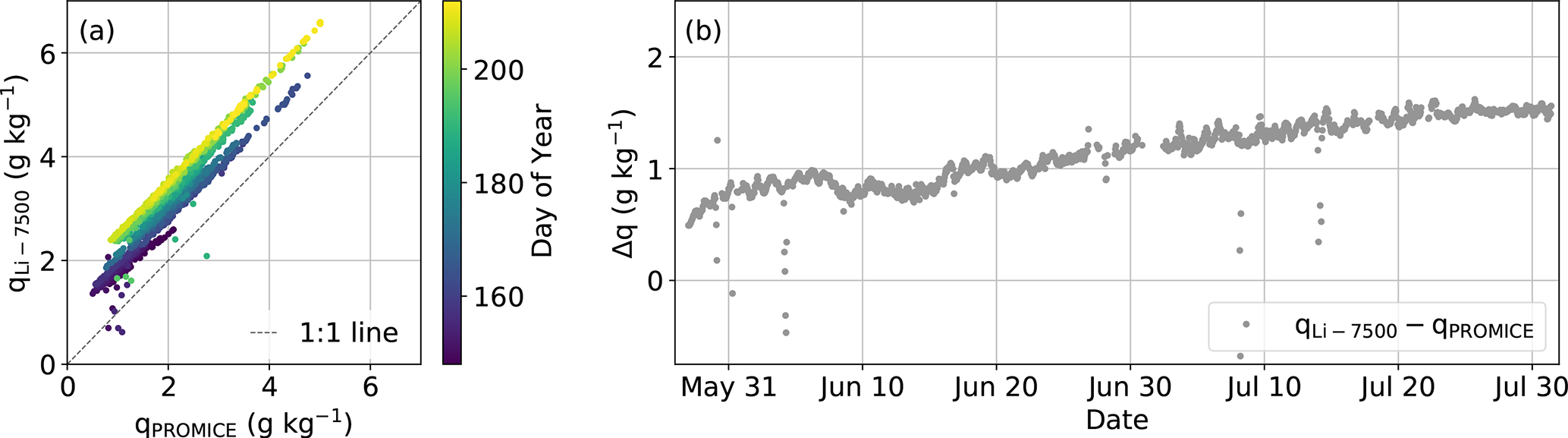 Figure 3(a) Comparison of the hourly averaged specific humidity measured by Li-7500 and PROMICE AWS. (b) The difference between the specific humidity measured by Li-7500 and PROMICE AWS as function of time through the campaign.