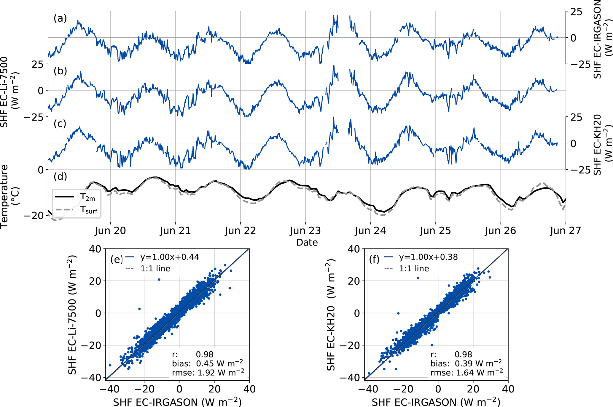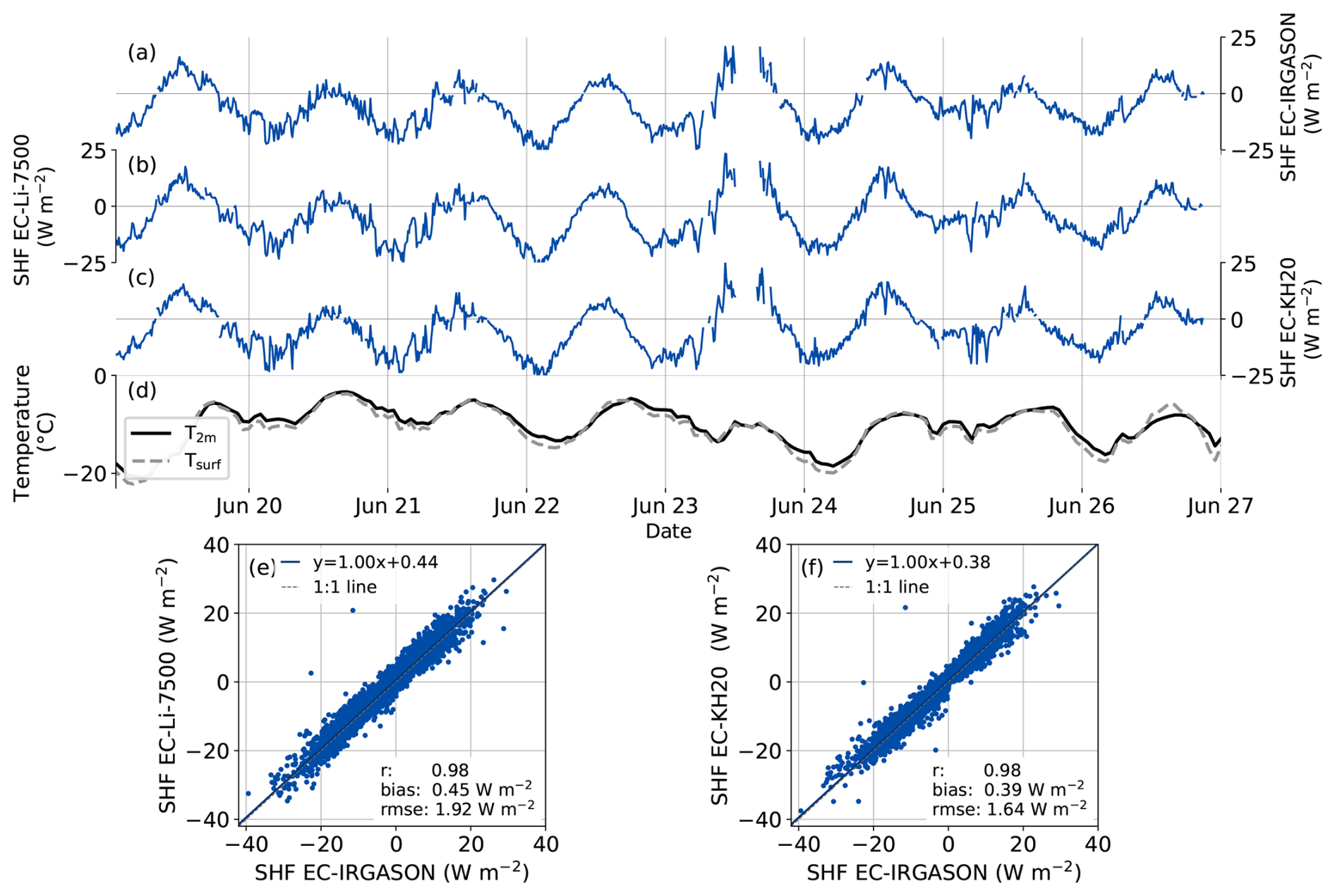 Figure 4Examples of time series of the SHF measured by (a) the EC-IRGASON, (b) EC-Li-7500 and (c) EC-KH20 and (d) the temperature at 2 m and at the surface based on PROMICE AWS measurements. Direct comparisons of the SHF during the entire campaign measured by the EC-Li-7500 and EC-KH20 versus EC-IRGASON are shown in panels (e) and (f). The EC and AWS data have a 10 min and hourly temporal resolution, respectively.
