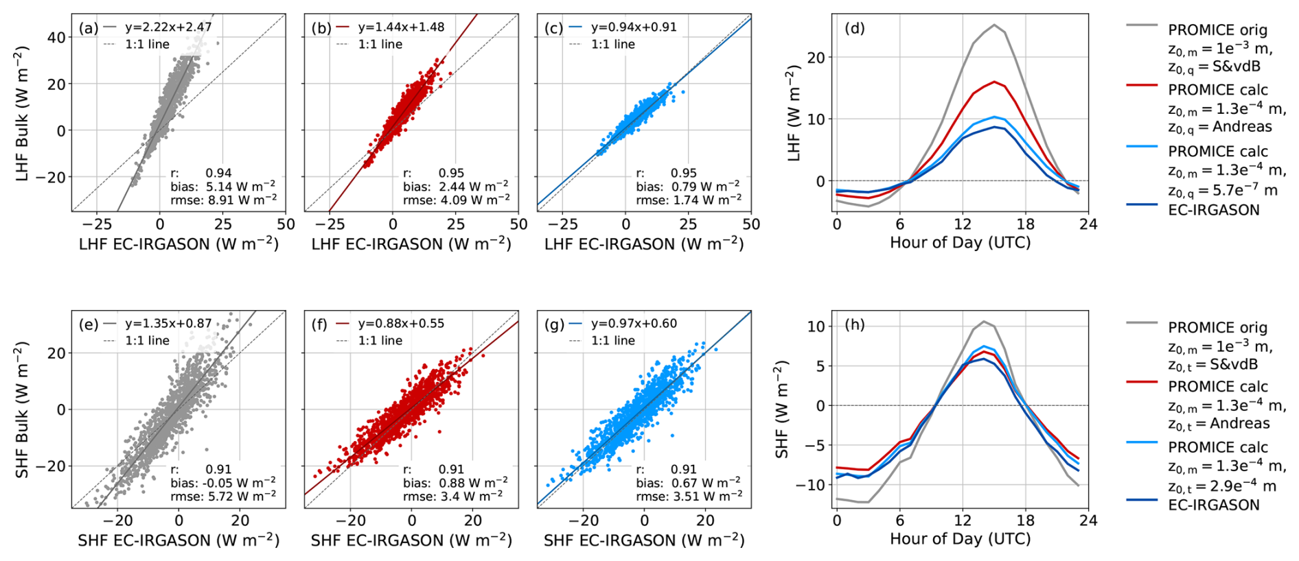 To obtain year-round measurements of the LHF and SHF to compare to the regional model output, the turbulent heat fluxes are calculated from the PROMICE AWS observations using the bulk method. We evaluate both the bulk-calculated LHF and SHF provided in the published PROMICE data product (Fausto et al.2021), as well as re-calculated LHF and SHF using site-specific roughness lengths, against the EC data in summer. Similar to Fausto et al. (2021), we calculate the SHF and LHF using the one-level bulk method, with equations 4 and 5 described in Van As (2011) (note the added minus results from the sign convention used in this study):