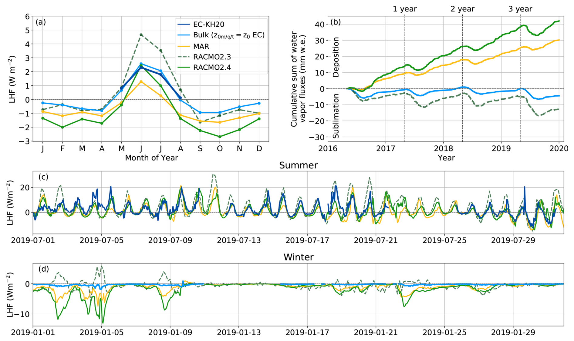 Figure 6(a) Seasonal cycle of the LHF from May 2016 until the end of 2019. (b) Cumulative LHF expressed in mm water equivalent (mm w.e.) (note the fluxes follow the SMB sign convention in this panel). Panels (c) and (d) show examples of time series of the LHF during summer and winter, respectively. LHFs are shown based on observations from the EC-KH20 and from calculations using the bulk method using observations from the PROMICE AWS. Simulated LHFs are based on the RCM's MAR, RACMO2.3 and RACMO2.4. The observational time series from the EC-KH20 is used due to its longer available record.
