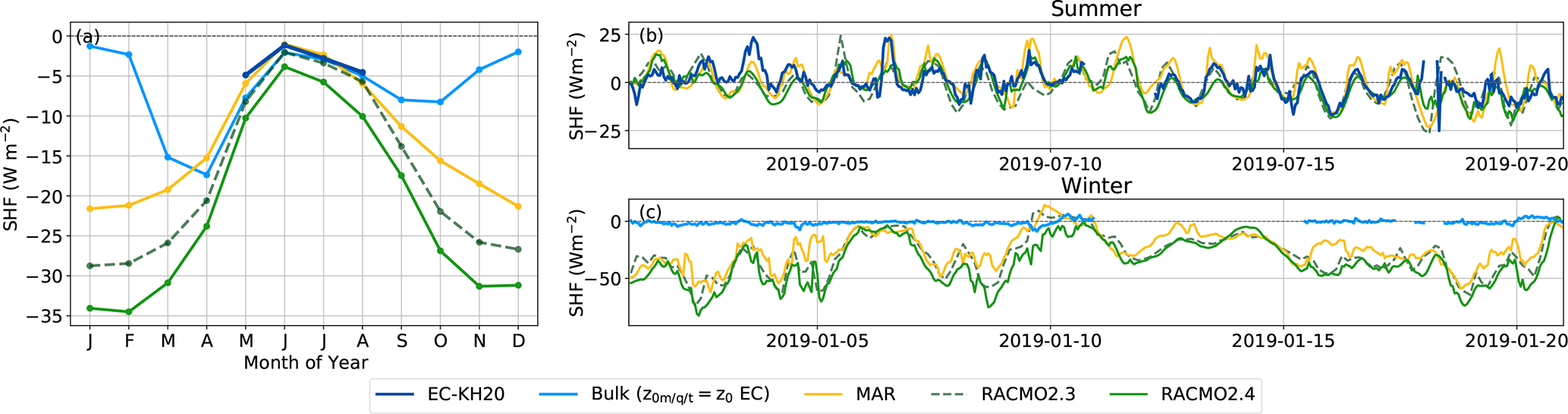 Figure 7(a) Seasonal cycle of the SHF from May 2016 until the end of 2019. Panel (b) and (c) examples of SHF time series for a 21 d period in summer and winter, respectively. SHFs are shown based on observations from the EC-KH20 and from calculations using the bulk method using observations from the PROMICE AWS. Simulated SHFs are based on the RCM's MAR, RACMO2.3 and RACMO2.4. The observational time series from the EC-KH20 is used due to its longer available record.