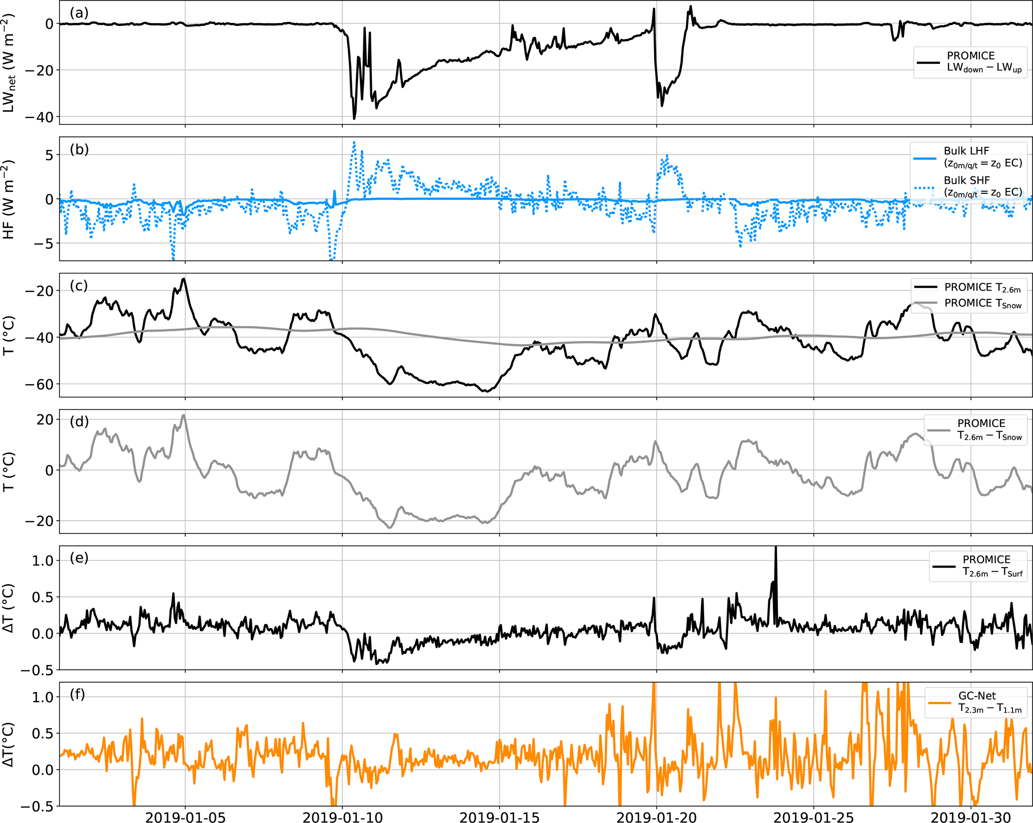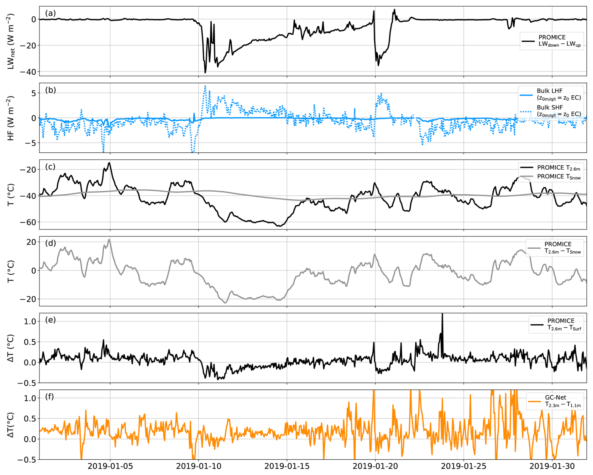 Figure 8Time series of winter AWS observations with (a) the net longwave radiation, (b) the calculated sensible and latent heat flux, using the z0,m, z0,q and z0,t values derived from the EC-Irgason, (c) the air temperature at 2.6 m above the surface and the snow temperature approximately 10 cm below the surface, (d) the temperature difference between the 2.6 m and snow temperature and (e) the PROMICE temperature difference between 2.6 m and the surface, determined via the longwave radiation and (f) the GC-Net temperature difference between 2.3 and 1.1 m. Note that the complete dataset is shown for this figure, including the data below 50 ° C. Comparison of the PROMICE AWS and model temperature gradients is analysed in Fig. 9. Separate up- and downward longwave radiation and a magnified view of the near-zero variability of the net longwave radiation are provided in Sect. S11.