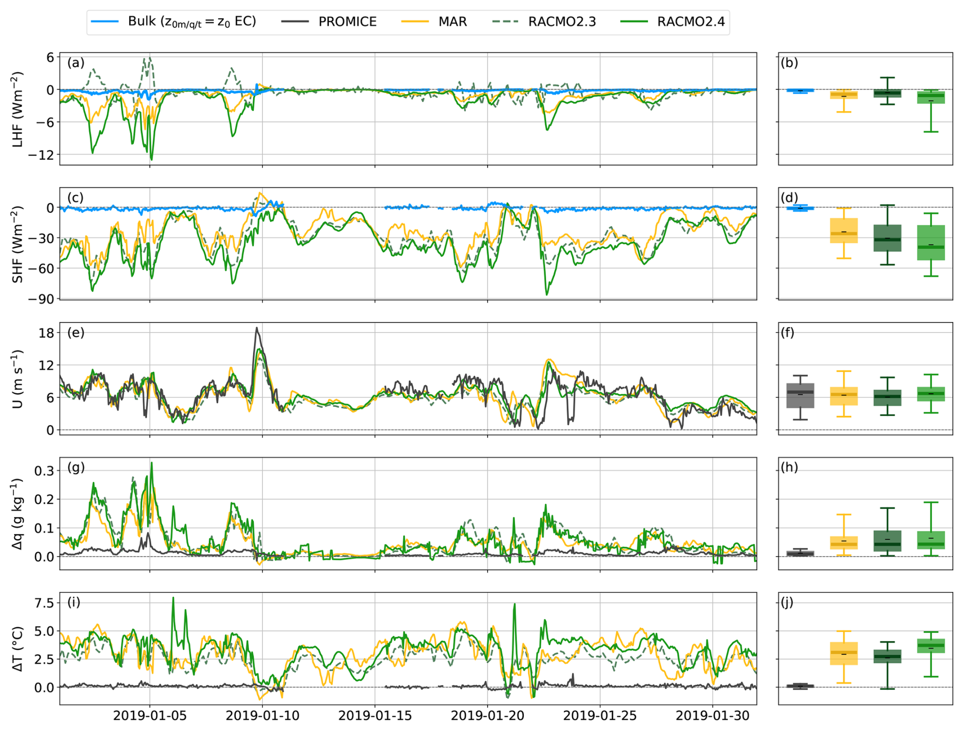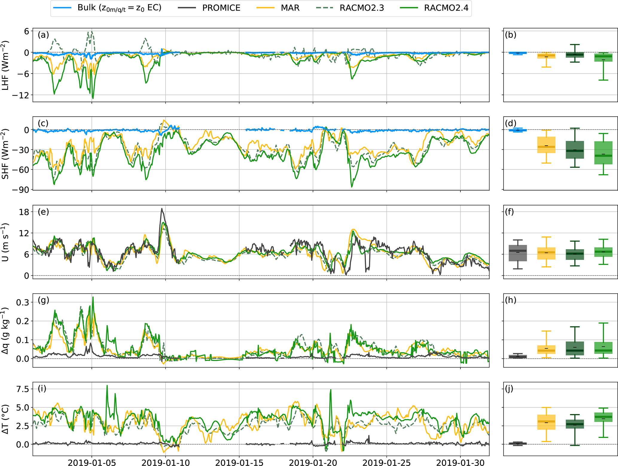 Figure 9Examples of winter time series showing (a) the SHF, (c) LHF, (e) windspeed, (g) specific humidity difference between 2 m and surface level and (i) temperature difference between 2 m and surface level. Panels (b), (d), (f), (h) and (j) show boxplots over the same period, where the whiskers indicate the 5th–95th percentile, the box the 25th to 75th percentile, the thick line the median and the black dash (–) the mean.