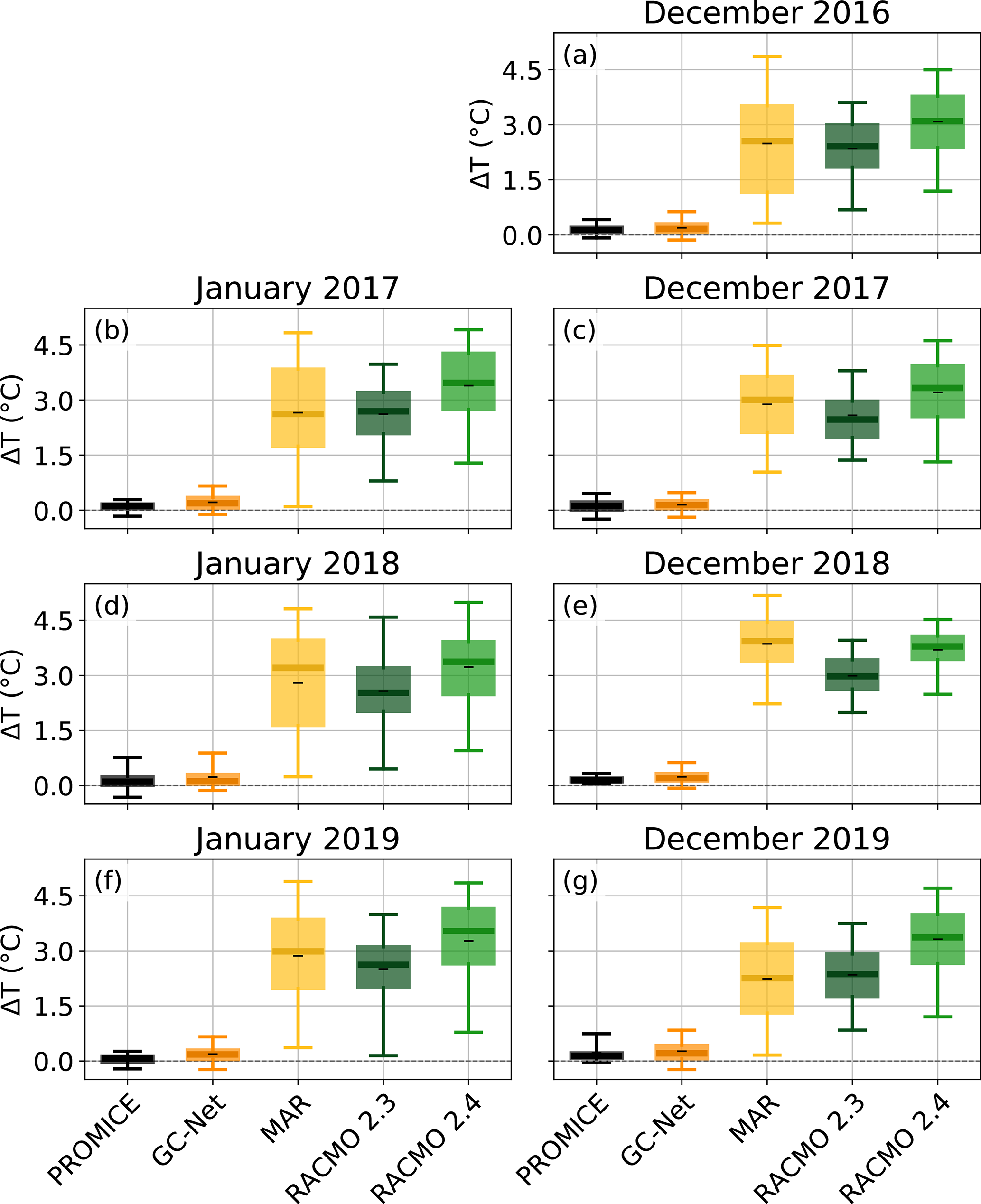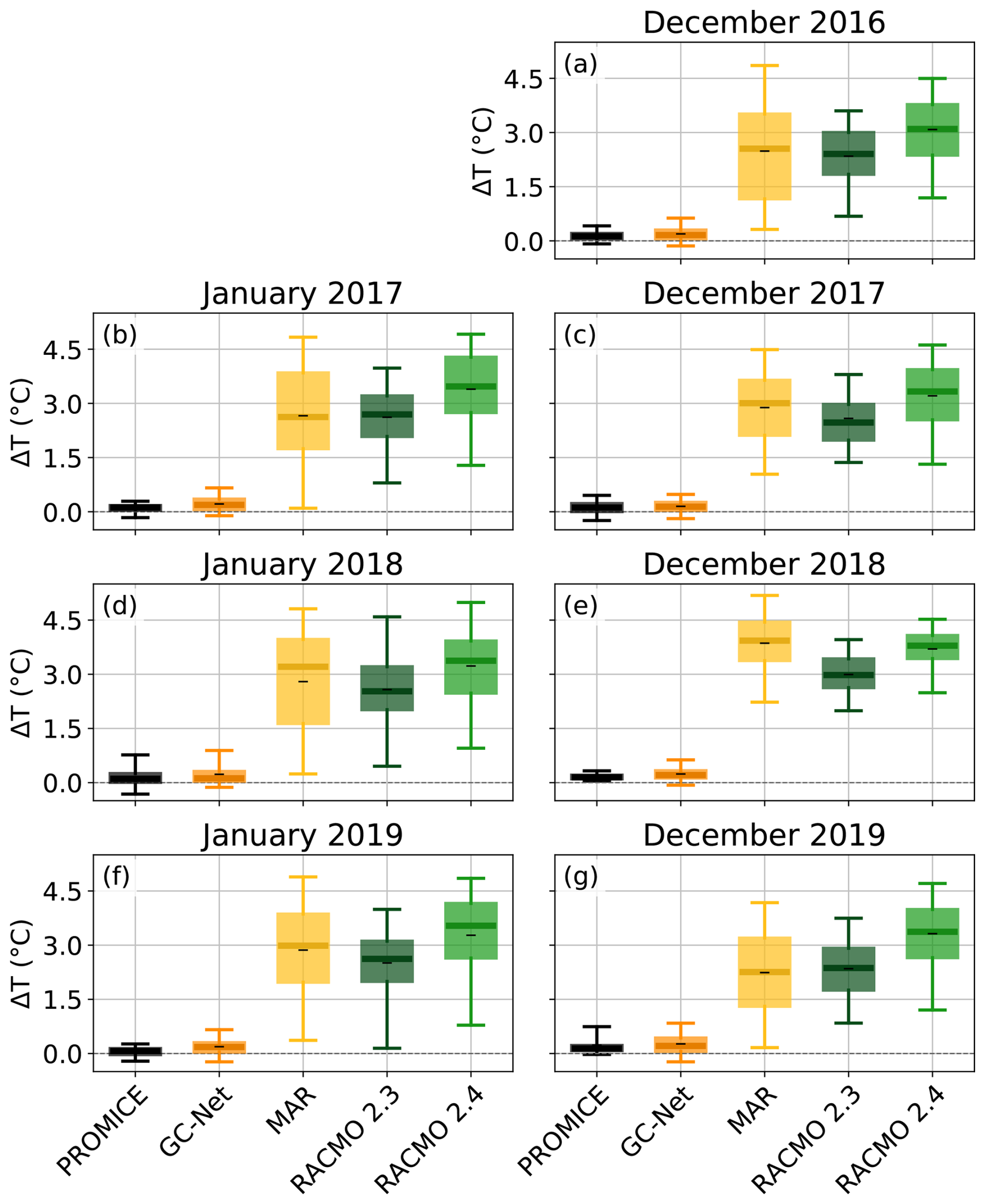 Figure 10Boxplots of the near-surface atmospheric temperature gradients of the winter months from the PROMICE and GC-Net AWS and the three RCMs MAR, RACMO 2.3 and RACMO 2.4. The whiskers of the boxplots indicate the 5th–95th percentile, the box the 25th to 75th percentile, the thick line the median and the black dash (–) the mean. Note that the temperature gradients of the PROMICE AWS and the three RCMs are between 2 m and the surface, while the GC-Net is between two air temperature sensors spaced 1.3 m apart, with the lowest approximately 1 to 2 m above the surface.