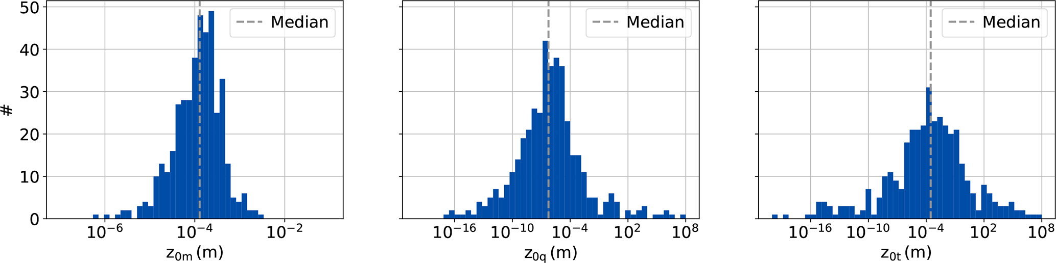 Here z is the height of the EC or PROMICE instruments above the snow surface, which are both 2.15 m during the measurement campaign in 2019. u(z) is the 2 m PROMICE wind speed and u* is the friction velocity, the value of which is based on the EC-IRGASON measurements and provided by TK3. The stability functions are the same as for the bulk calculation. wa is the EC-IRGASON covariance of the absolute humidity. Thus, 2 m and surface saturated specific humidity obtained from the PROMICE AWS are converted to absolute humidity. wT is the EC-IRGASON covariance and T(z) and Ts are the 2 m and surface temperature from the PROMICE AWS. Similar to u*, the a* and T* are turbulent humidity and temperature scales. The 10 min EC-IRGASON data is averaged to hourly values, to match the PROMICE time resolution. The value for the roughness lengths is then determined by filtering the values for neutral conditions (0.02 <z/L< 0.02) and for z0,m for sufficient wind (U>3 m s−1) and taking the median. The median is taken due to the large range of magnitude in the results, making the mean unsuitable (see Fig. B1). This gives the following values: z0,m = 1.3×10-4, z0,q = 5.7×10-7 and z0,t = 2.9×10-4m. The value for z0,m is similar to the roughness lengths of 1.6×10-4m recorded by Van den Broeke et al. (2005b) in the katabatic wind zone in Antarctica.