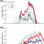 The practical impact of the DAvar and DAconst experiments on snow depth estimates is illustrated in Fig. 2. When the assimilated snow depth retrieval is 1 m, the observation uncertainty is equivalent for both experiments (Fig. 1). The variable observation uncertainty approach in DAvar dynamically adapts to assimilated snow depth, resulting in stronger corrections for shallow depths while DAconst provides stronger corrections at higher depths (Fig. 2). For assimilated snow depths below 1 m, the observation uncertainty is smaller in DAvar than in DAconst, resulting in a lower observation error covariance (σobs) in the EnKF (Eq. 1) and stronger corrections of the posterior state toward the observations in DAvar (Fig. 2a). In contrast, the constant σobs of 0.3 m in DAconst is relatively large for shallow snow depths and results in minimal corrections of the posterior state.