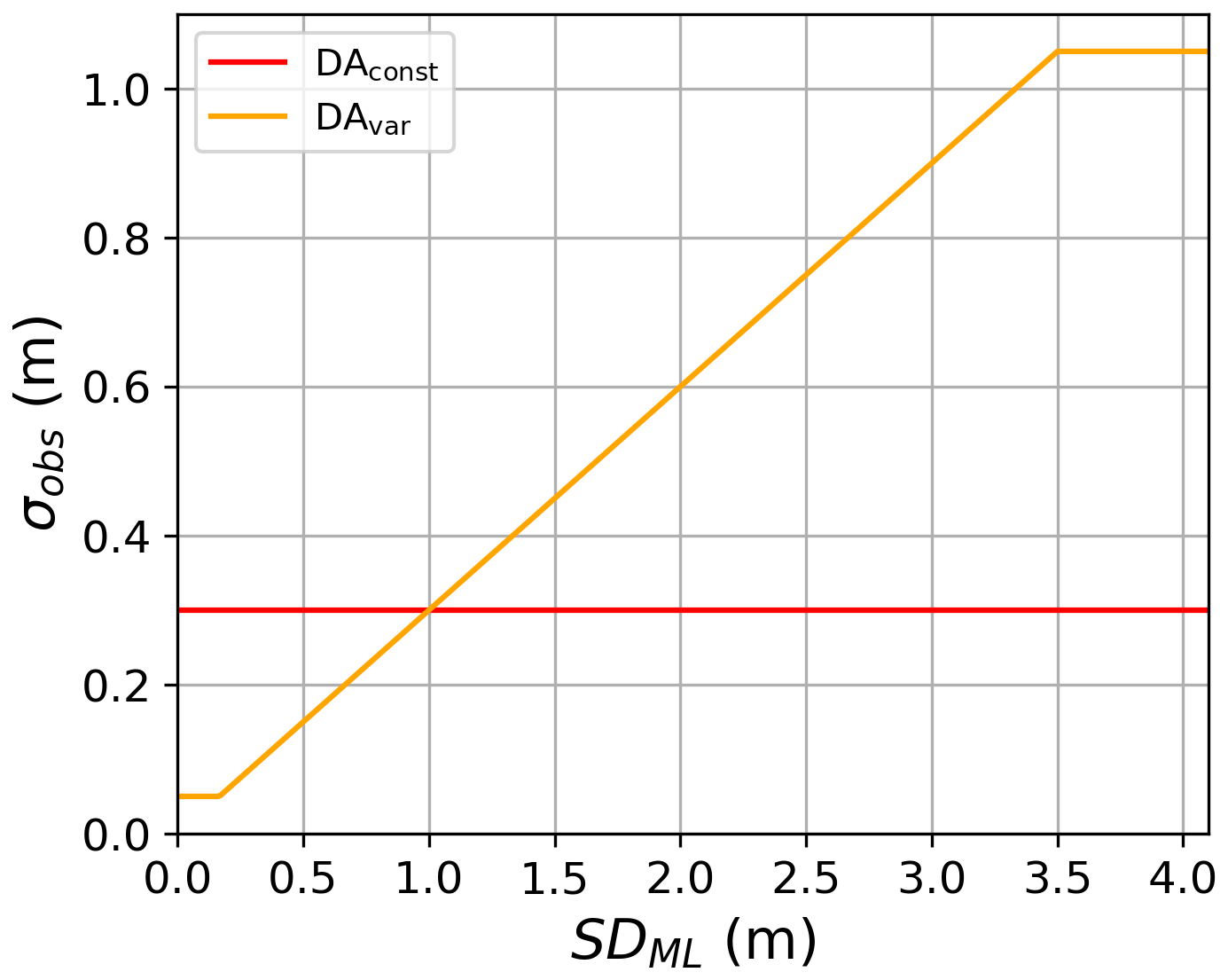 where SDML(x,t) is the assimilated observation at location x and time t and m is a user-defined multiplier. We calibrated m experimentally by selecting the optimal value when comparing modeled snow depth with in-situ observations in a subset region (45–46° N, 6–8° E). Here, we used m=0.3. Equation (2) assumes that σobs varies linearly as a function of assimilated snow depth. Figure S1 in the Supplement demonstrates that this assumption is valid at independent in-situ measurement sites. For SDML below 0.25 m, the average error of the SDML product compared to in-situ measurements is 0.05 (Fig. S1), and as such we chose this as a minimum threshold value for σobs (Eq. 2). Setting this minimum threshold also avoids issues when SDML(i,t) = 0 m. We can see from Fig. S1 that there are no assimilated snow depths above 3 m at these in-situ measurement sites, making it difficult to characterize the observation error for deeper assimilated snow depths. As such, we also defined an upper threshold for σobs of 1.05 m, corresponding to an assimilated snow depth of 3.5 m (Eq. 2). This value was also chosen as an upper threshold because we observed that σf, which represents the uncertainty in the model-only (OL) simulated snow depth, given by the standard deviation of the model ensembles, levels off above 3.5 m snow depth (Fig. S2). We chose to reflect this feature of the forecast error in our characterization of the observation error. Figure 1 compares σobs from DAconst and DAvar as a function of the assimilated snow depth observation (SDML).