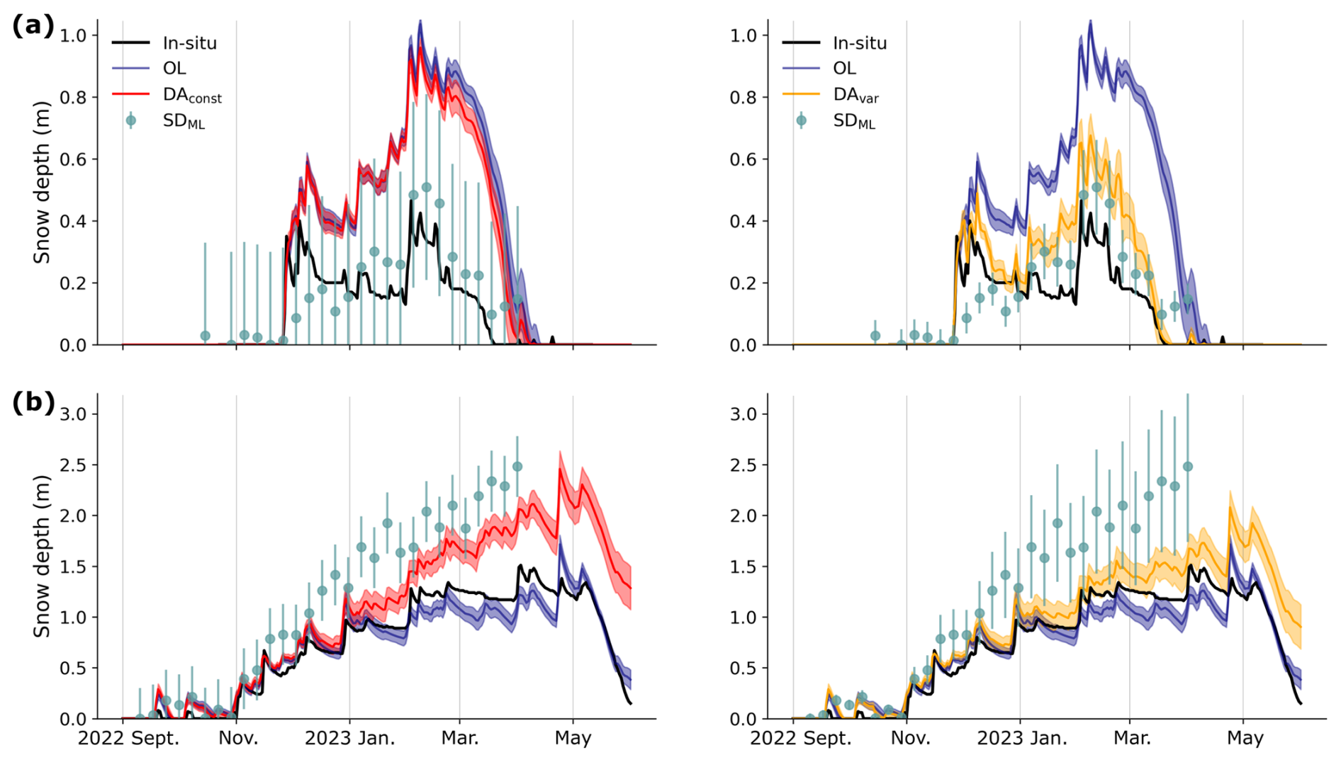 For each of our three experiments (OL, DAconst, DAvar), we utilized a variety of in-situ and satellite-based products to evaluate (1) snow depth, (2) SWE, and (3) snow cover fraction (SCF) and snow disappearance date (SDD). We also compared our results with those from De Lannoy et al. (2024), in which the SDS1 retrieval was assimilated with a static observation uncertainty.
