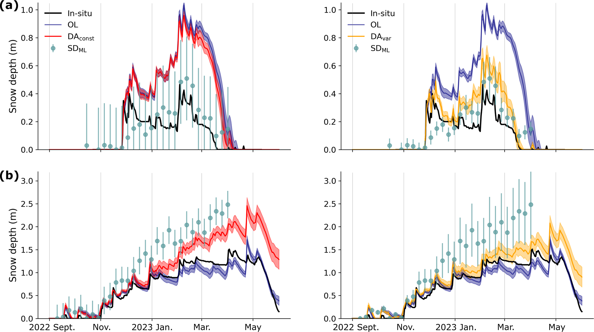 Previous work has assimilated snow depths retrieved from the S1 satellite constellation over the European Alps (SDS1; Brangers et al., 2024; De Lannoy et al., 2024). Here, we assimilated snow depth estimates from Dunmire et al. (2024) (SDML), which uses machine learning to enhance S1-based snow depth retrievals. Dunmire et al. (2024) use an eXtreme Gradient Boosting (XGBoost) model that incorporates 12 input features (elevation, slope, aspect angle, topographical position index, snow class, forest cover fraction, day of snow season, snow cover fraction, cumulative snow cover fraction, local incidence angle of the S1 observation, S1 VV backscatter, and S1 cross-polarization ratio) to estimate snow depth across the European Alps at 100 m resolution. When compared to in-situ snow depth stations and airborne photogrammetry snow depth maps, SDML is shown to reduce MAE and improve bias compared to SDS1 (MAE reduction from 0.22 m for SDS1 to 0.18 m for SDML, bias improvement from −99 mm for SDS1 to −8 mm for SDML) (Dunmire et al., 2024; Lievens et al., 2022).