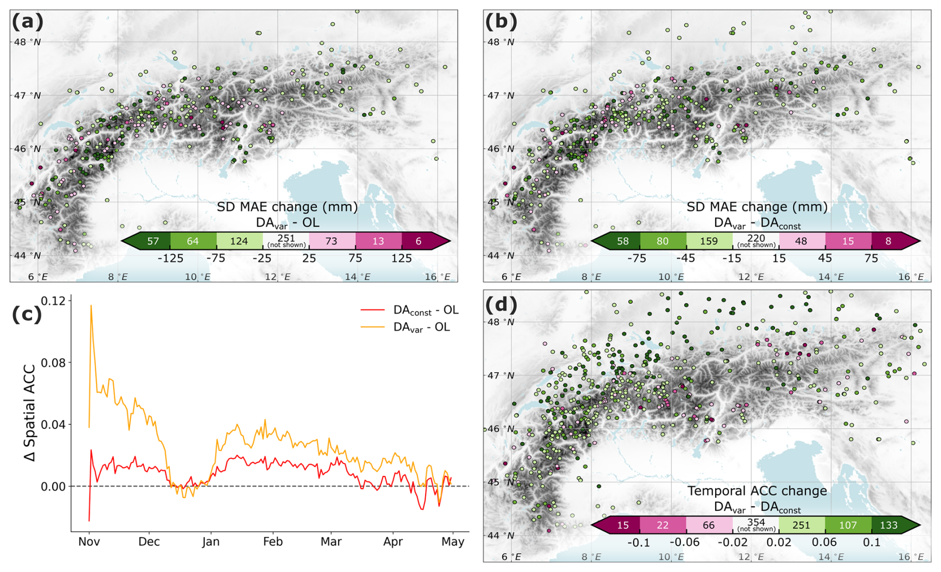 Figure 3Experiment evaluation at in-situ snow depth measurement sites. (a) Change in MAE at each measurement site from the OL experiment to DAvar. Green colors indicate an improvement in MAE in the DAvar experiment. On the color bar, the number of sites that fall within each color range is indicated and points within the white color are not plotted on the map. (b) Change in MAE at each measurement site from the DAconst experiment to DAvar. (c) Change in the spatial anomaly correlation coefficient (ACC) for each DA experiment from the OL experiment. The spatial ACC is averaged over all snow seasons (2015/16–2022/23). (d) Change in the temporal ACC from the DAconst experiment to DAvar. Green colors indicate an improvement in temporal ACC in the DAvar experiment.