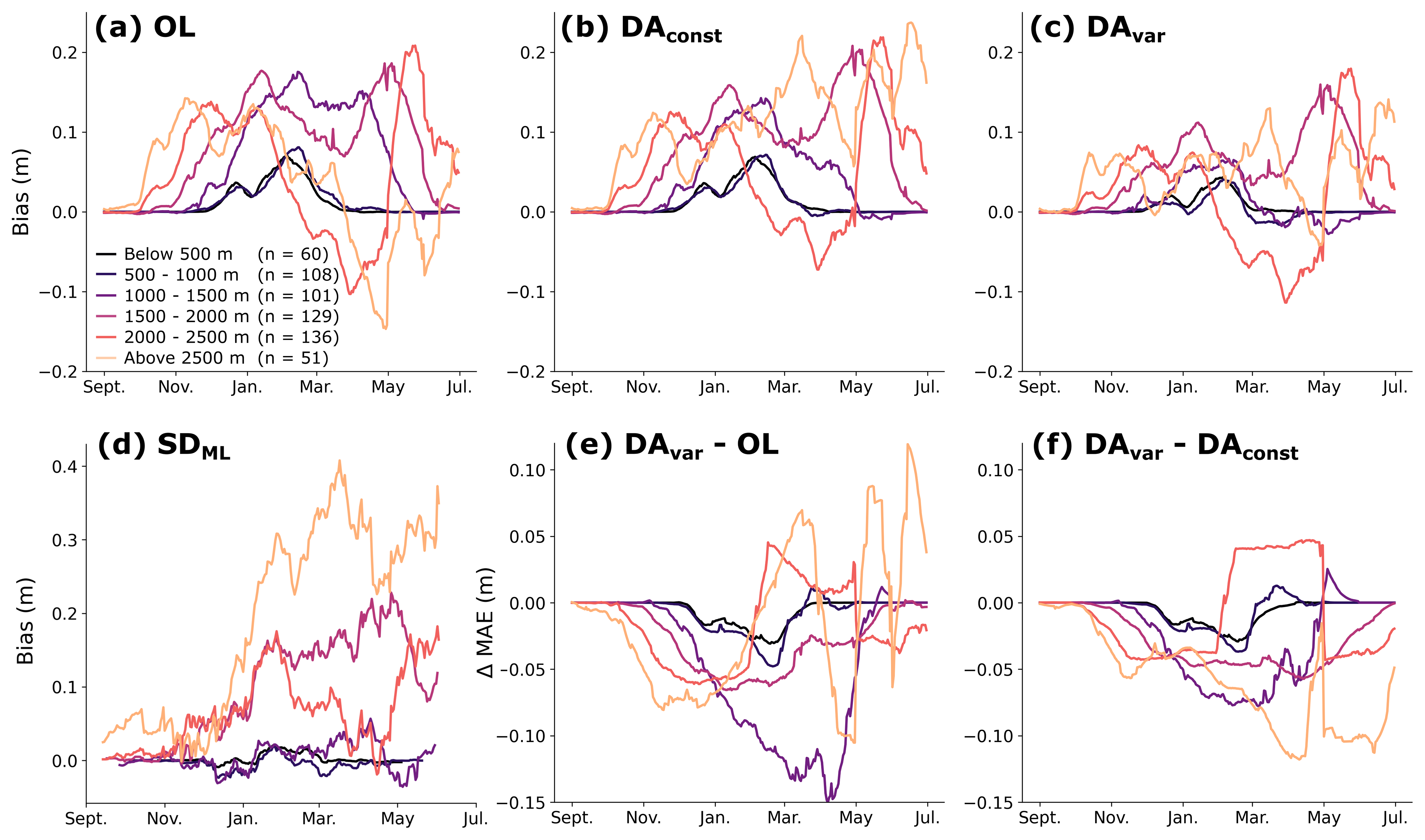 Figure 4Seasonal evolution of bias and mean absolute error (MAE) stratified by elevation. Panels (a–d) show the seasonal snow depth bias for the (a) OL, (b) DAconst, and (c) DAvar experiments, and for (d) the assimilated observations (SDML). Bias is computed relative to in-situ snow depth measurements and is grouped by elevation bands (indicated by different colors). Panels (e) and (f) show the change in MAE between the OL and DAvar experiments (e) and between the DAconst and DAvar experiments (f). Negative values in (e, f) indicate improved performance (decreased MAE). Statistics are computed for each day, averaged over the entire 8 year period (2015–2023). A 14 d smoothing is applied to each timeseries and the number of in-situ measurement sites (n) within each elevation band is provided in the legend.