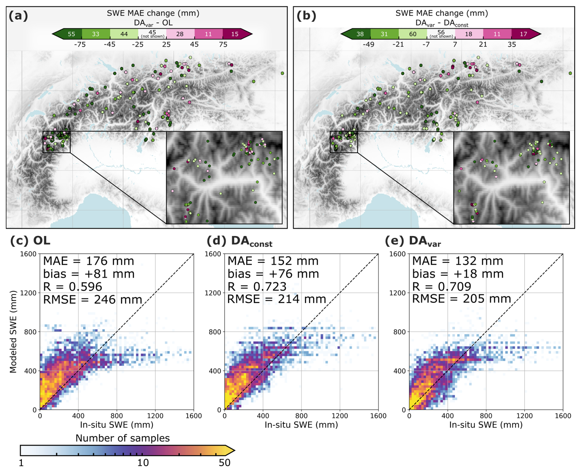 Figure 5Evaluation of SWE from the OL and DA experiments against in-situ measurements. (a, b) Change in SWE MAE (a) DAvar relative to the OL experiment, and (b) DAvar relative to DAconst, where green indicates error reduction and magenta indicates a deterioration in performance. Measurements from within the same 1 km model grid cell are averaged for visualization purposes. On the color bar, the number of sites that fall within each color range is indicated and points within the white color are not shown on the map. (c–e) 2D histograms comparing modeled SWE to in-situ SWE observations for (c) OL, (d) DAconst, and (e) DAvar. All non-zero SWE measurements are included and the spatiotemporal MAE, bias, R, and RMSE are provided for each approach.