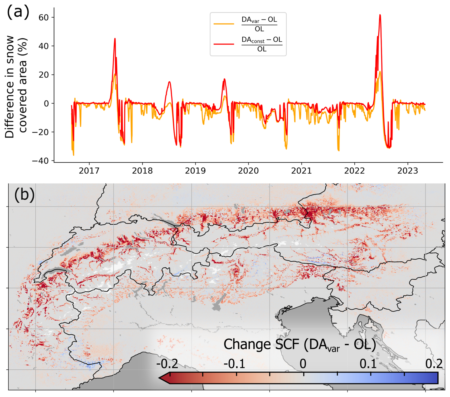 Figure 7Difference in estimated snow covered area. (a) Timeseries of the percent difference in total snow covered area between DAvar and OL (orange), and DAconst and OL (red). (b) Average change in snow cover fraction (SCF) between the DAvar and OL experiments during the period 1–7 March (all years). White indicates glaciers.