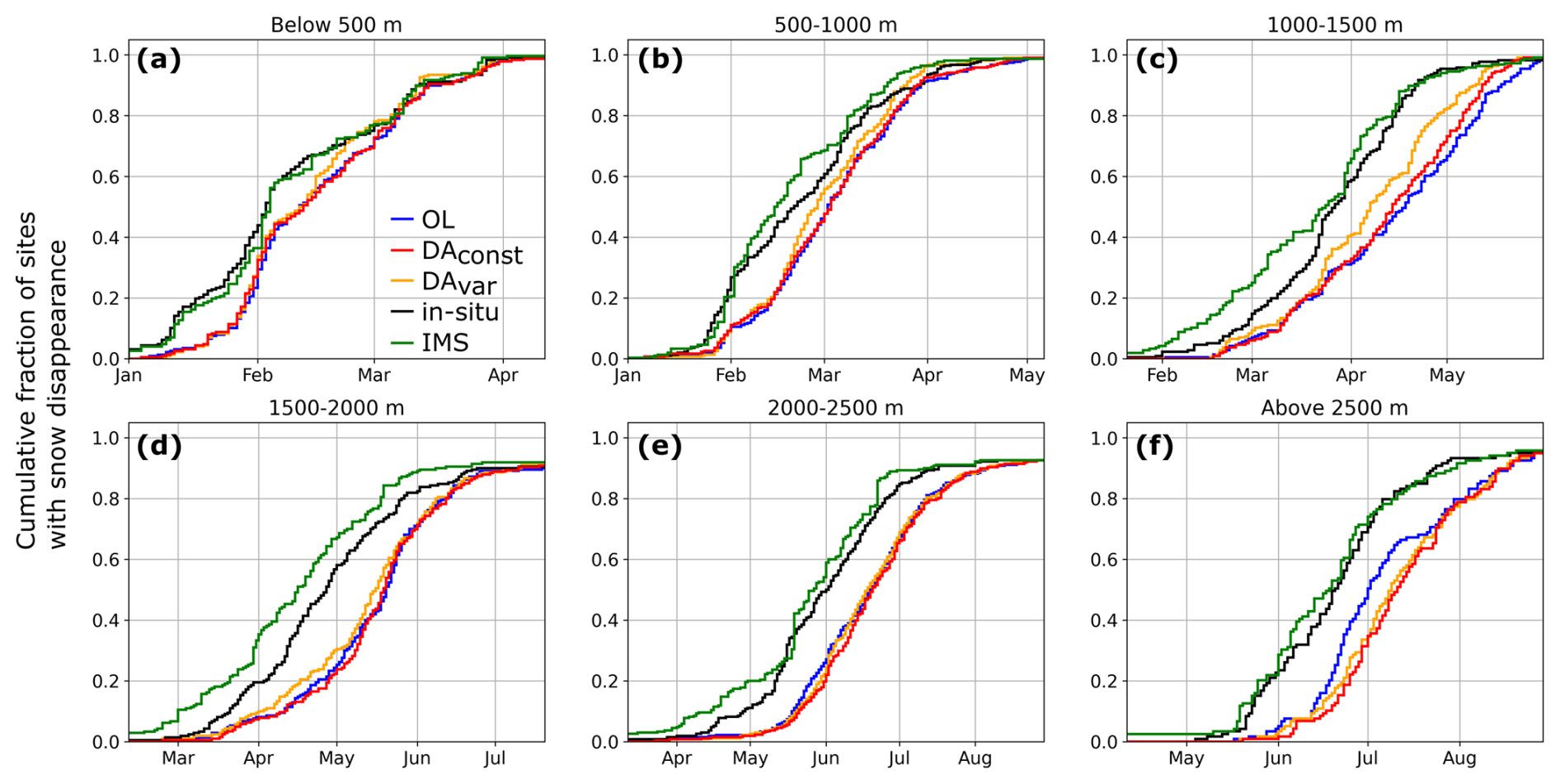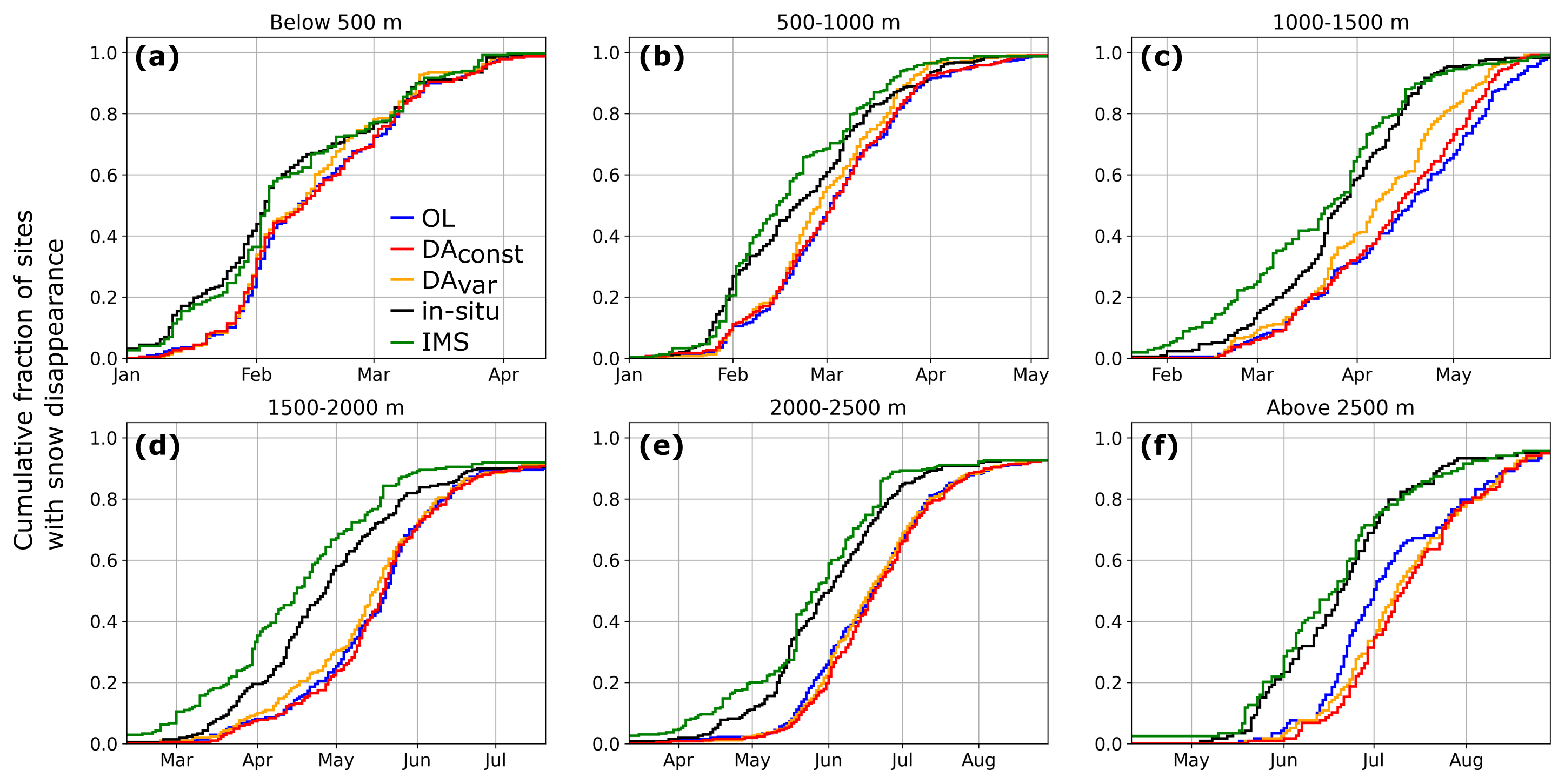 Figure 8Cumulative fraction of measurement sites with snow disappearance (following peak snow depth) at in-situ measurement sites, stratified by elevation: (a) below 500 m, (b) 500–1000 m, (c) 1000–1500 m, (d) 1500–2000 m, (e) 2000–2500 m, (f) above 2500 m.