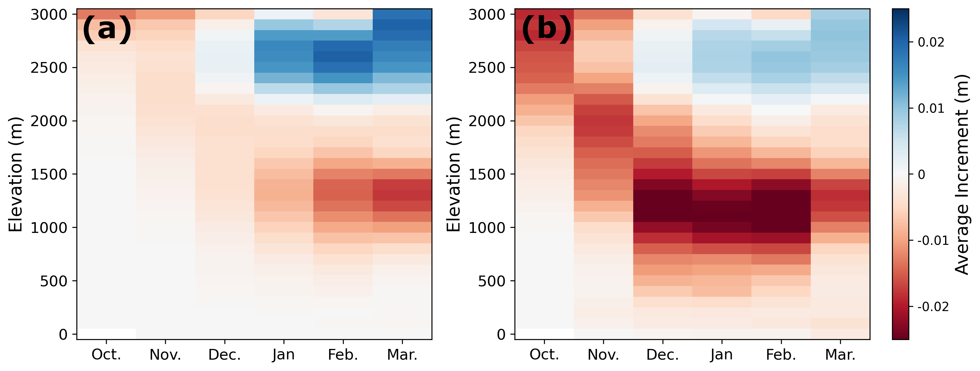 Figure 9Average total snow depth increments (m) over the accumulation season (x-axis), stratified by elevation (y-axis) for (a) DAconst and (b) DAvar. Increments are averaged over all years (2015–2023)