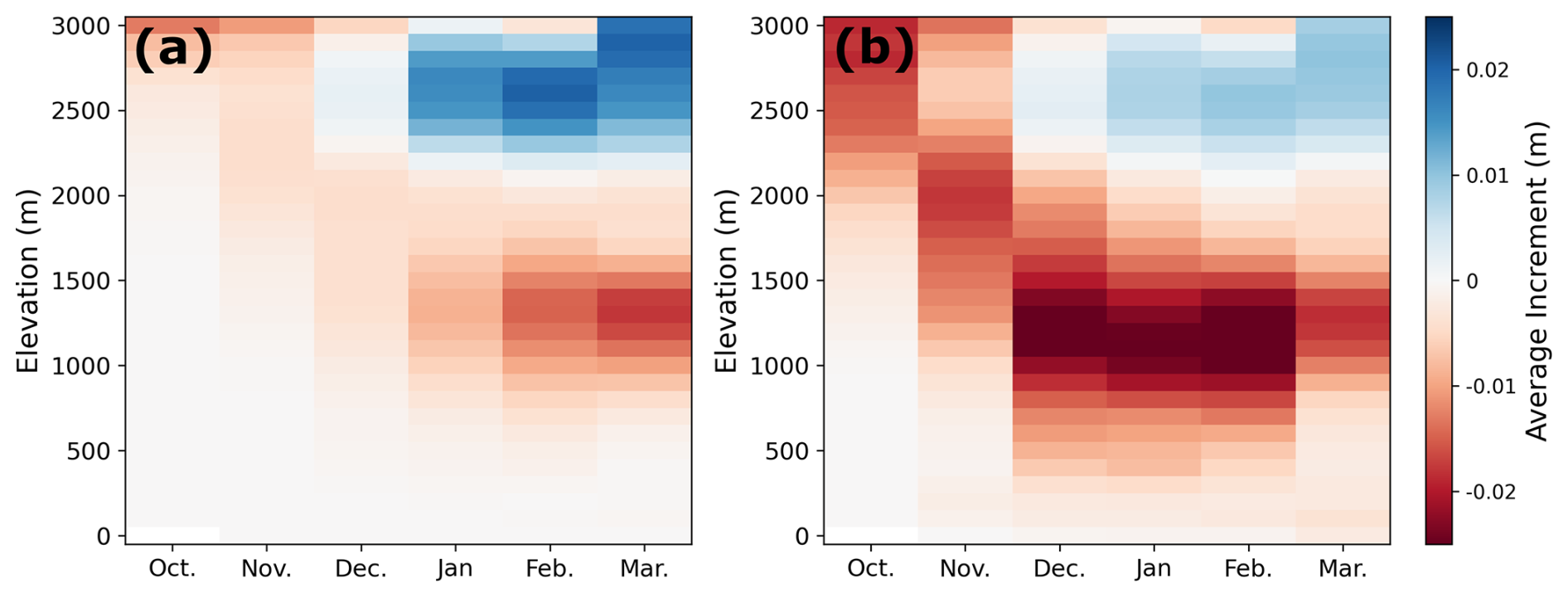 In DAconst, model updates predominantly occur later in the accumulation season, with positive average increments above 2500 m and negative average increments below 1500 m (Fig. 9a). In contrast, DAvar exhibits stronger negative increments earlier in the snow season, and at lower elevations (Fig. 9b), suggesting that assimilated observations influence the entire accumulation period rather than just times near peak SWE. Additionally, the magnitude of positive increments in DAvar is reduced, meaning that less snow is added at higher elevations in DAvar. While the OL has a negative snow bias in these higher elevation areas, the weaker positive increments in DAvar may be more realistic, given that Fig. 4b indicates a strong positive snow depth bias for sites about 2500 m in DAconst, and a reduced positive bias at these same sites in DAvar.