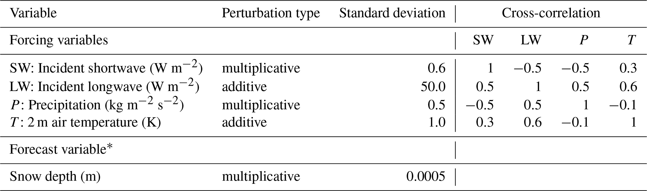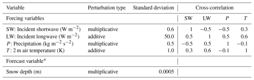 Table 1Perturbation parameters applied for the OL and DA runs. ∗ We perturb the total snow depth and propagate these perturbations into the different snow layers.