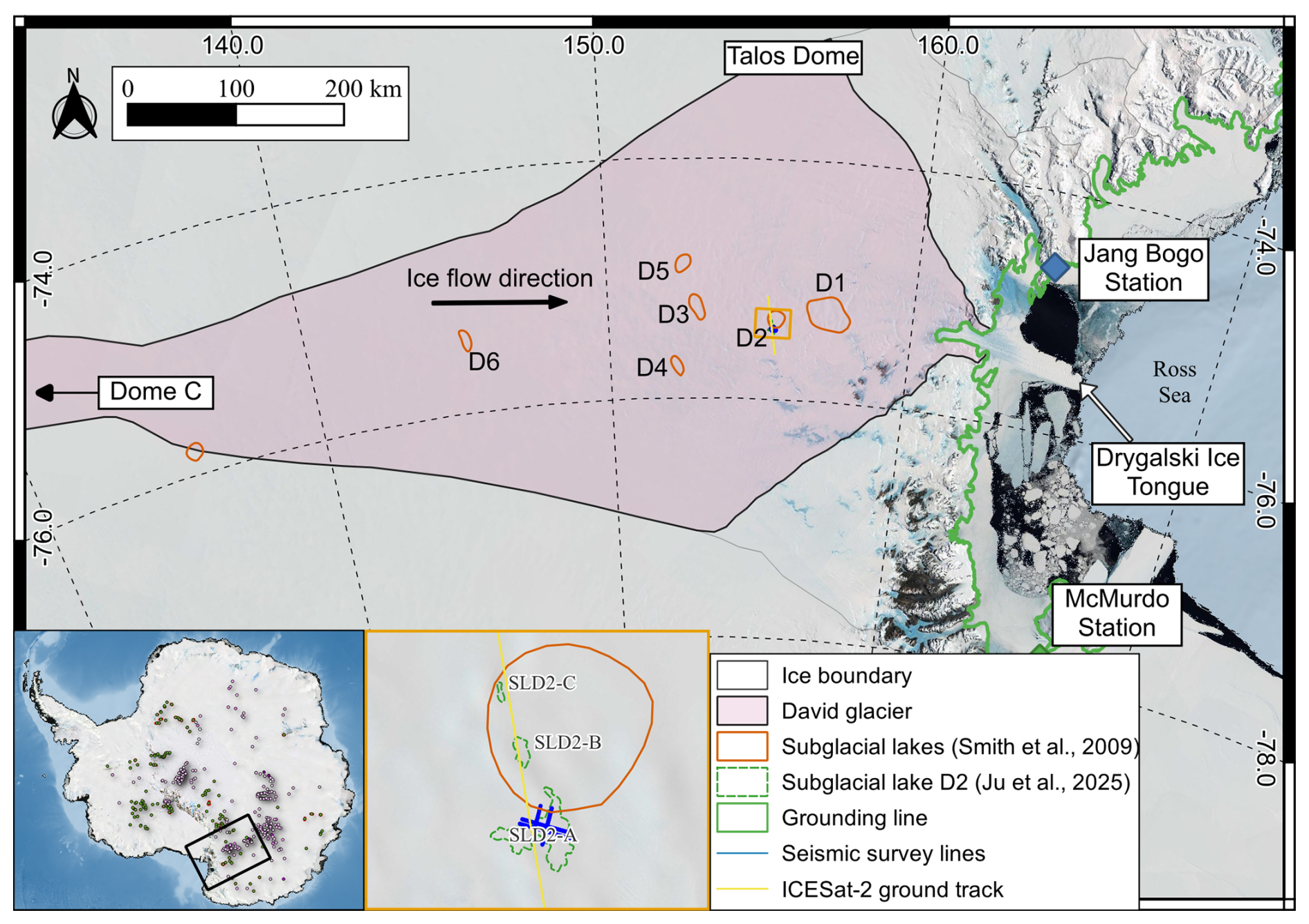David Glacier, located in Victoria Land, East Antarctica, originates from the Dome C and Talos Dome regions and flows seaward through the Drygalski Ice Tongue (Fig. 1). The mass balance of glaciers from 1979 to 2008 has been estimated at 7.5 ± 0.4 Gt yr−1 (Rignot et al., 2019), while the mean ice discharge over the more extended period from 1979 to 2017 was reported to be approximately 9.7 Gt yr−1 (Frezzotti et al., 2000; Rignot et al., 2019). According to Smith et al. (2020), satellite altimetry observations from ICESat-1 and ICESat-2 (20032019) indicate that the grounded portion of David Glacier experienced a mass gain of 3 ± 2 Gt yr−1, whereas the adjacent ice shelves exhibited a mass loss of −1.6 ± 1 Gt yr−1. Although the overall mass balance of David Glacier currently appears stable, several active subglacial lakes observed by satellites have the potential to influence glacier dynamics (Ju et al., 2025; Kim et al., 2025).