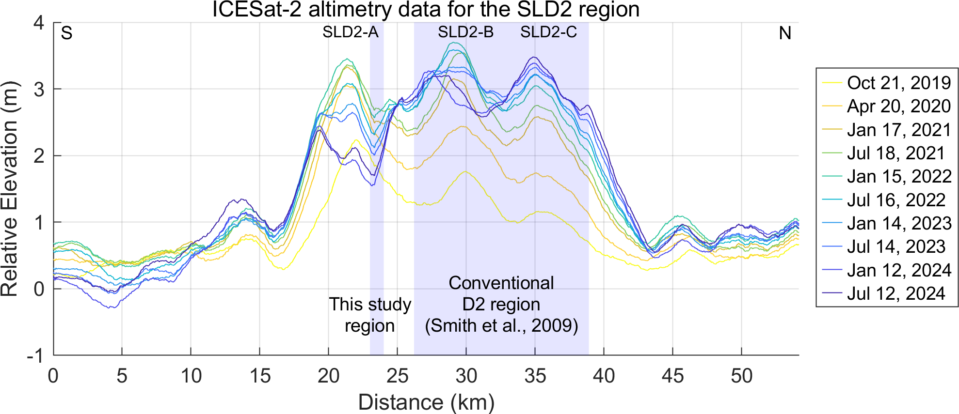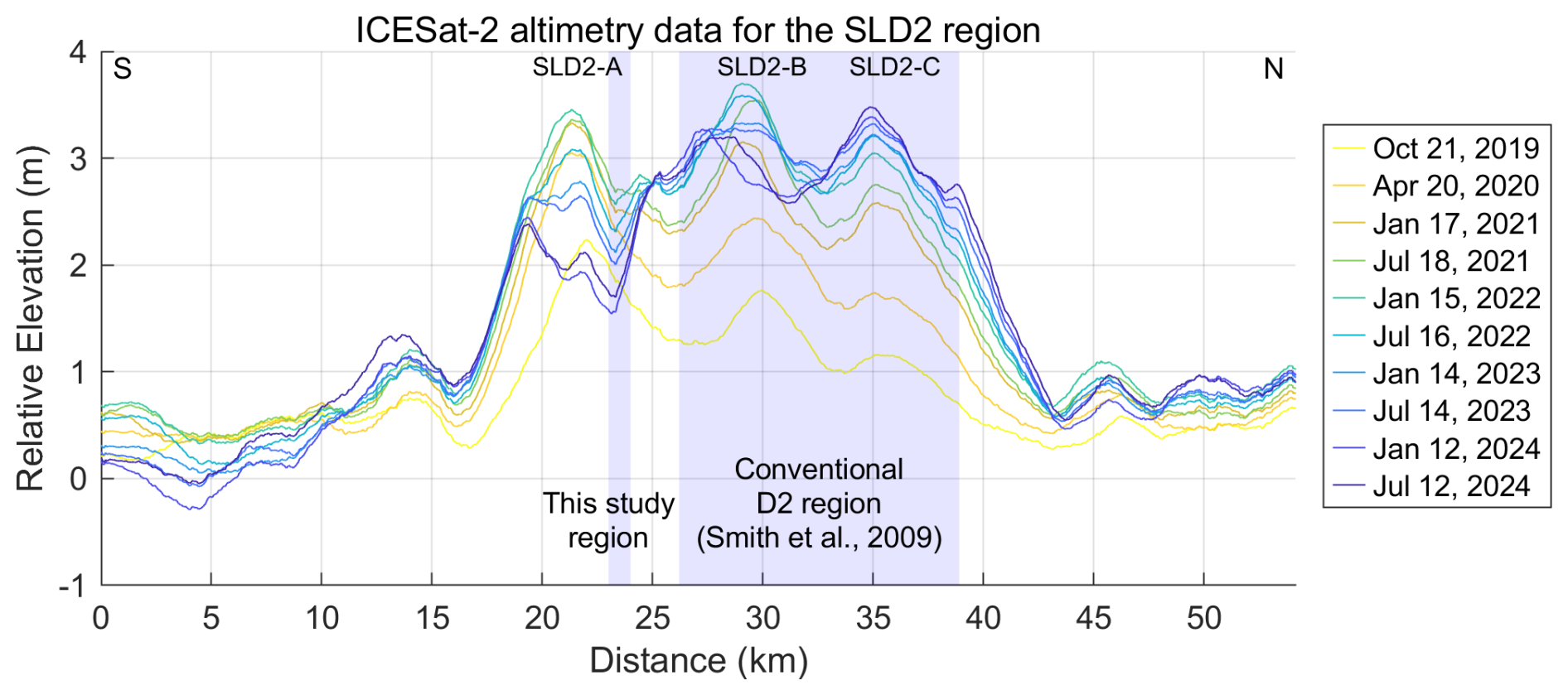 Figure 2Glacier surface elevation changes derived from ICESat-2 altimetry between 22 April 2019 and 12 July 2024. The x-axis corresponds to the 22 April 2019 dataset, and all subsequent elevation changes are referenced to this date. The light blue shaded region indicates the spatial overlap between the conventional SLD2 region identified by Smith et al. (2009) and our study region.