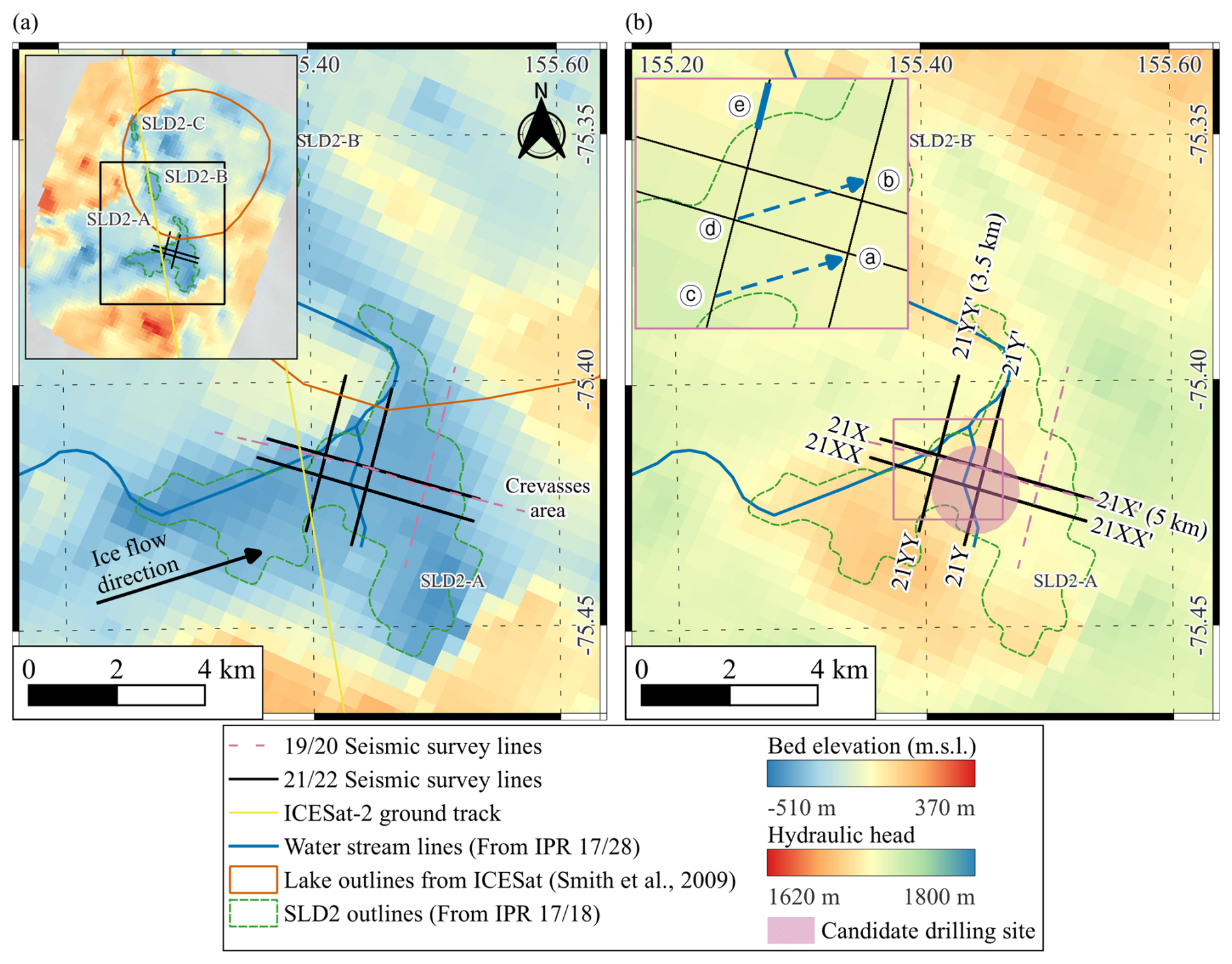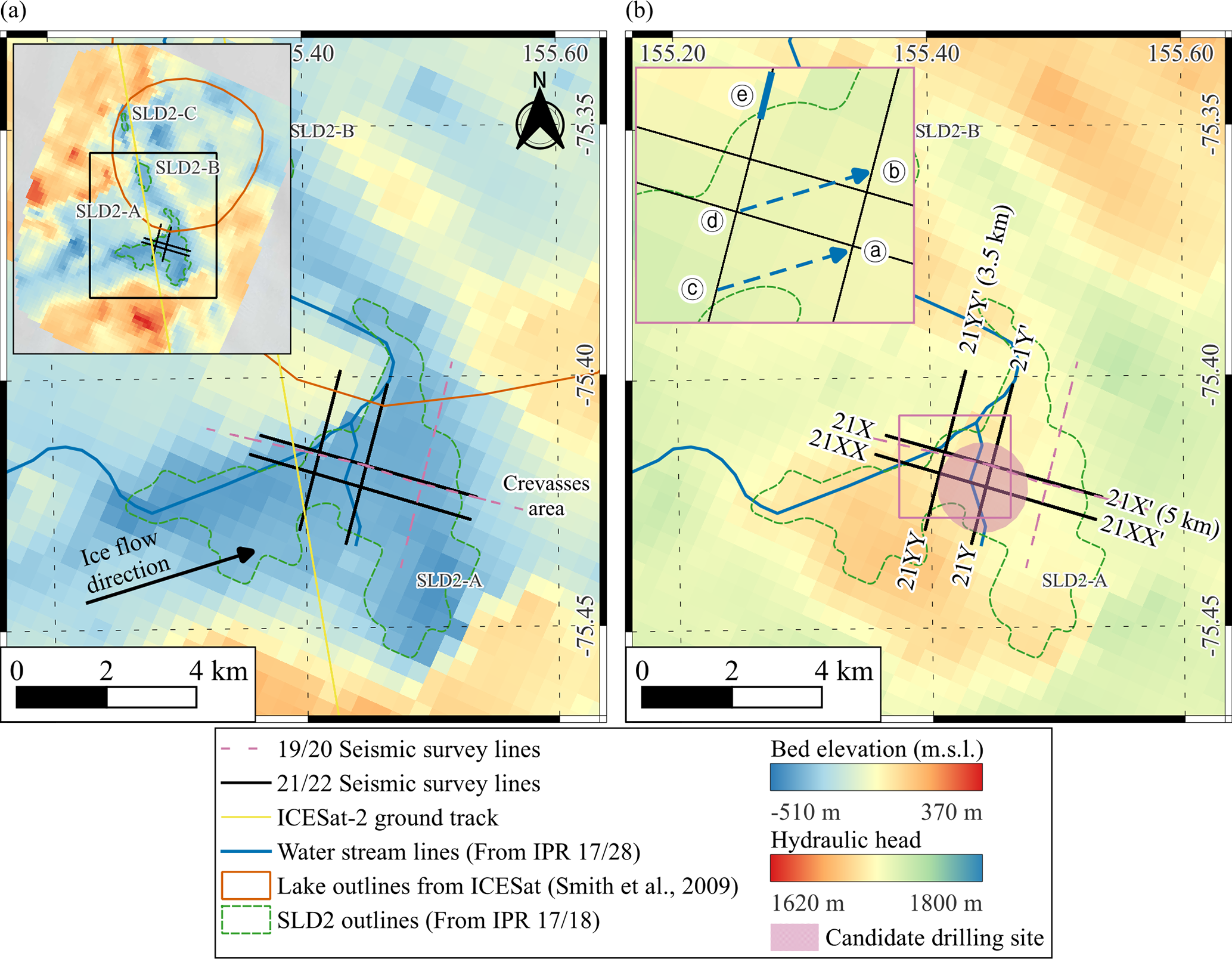 To better constrain the extent and basal conditions of SLD2, we used airborne IPR data collected during the 2016/17 (Lindzey et al., 2020) and 2018/19 (Ju et al., 2025) field campaigns. These surveys show that the glacier surface elevations in the SLD2 region range from approximately 1820 to 1940 m. The corresponding ice thicknesses vary between 1685 and 2293 m. Furthermore, the observations of moderately enhanced radar bed echoes relative to the surrounding area, elevated specularity values (> 0.4), depressed basal elevations (≤ −350 m), the presence of a basin-like topography, a lower hydraulic head than the surroundings, and low hydraulic gradients (≤ 0.84°) collectively suggest a high potential for the presence of subglacial water beneath SLD2. (Ju et al., 2025; Lindzey et al., 2020).