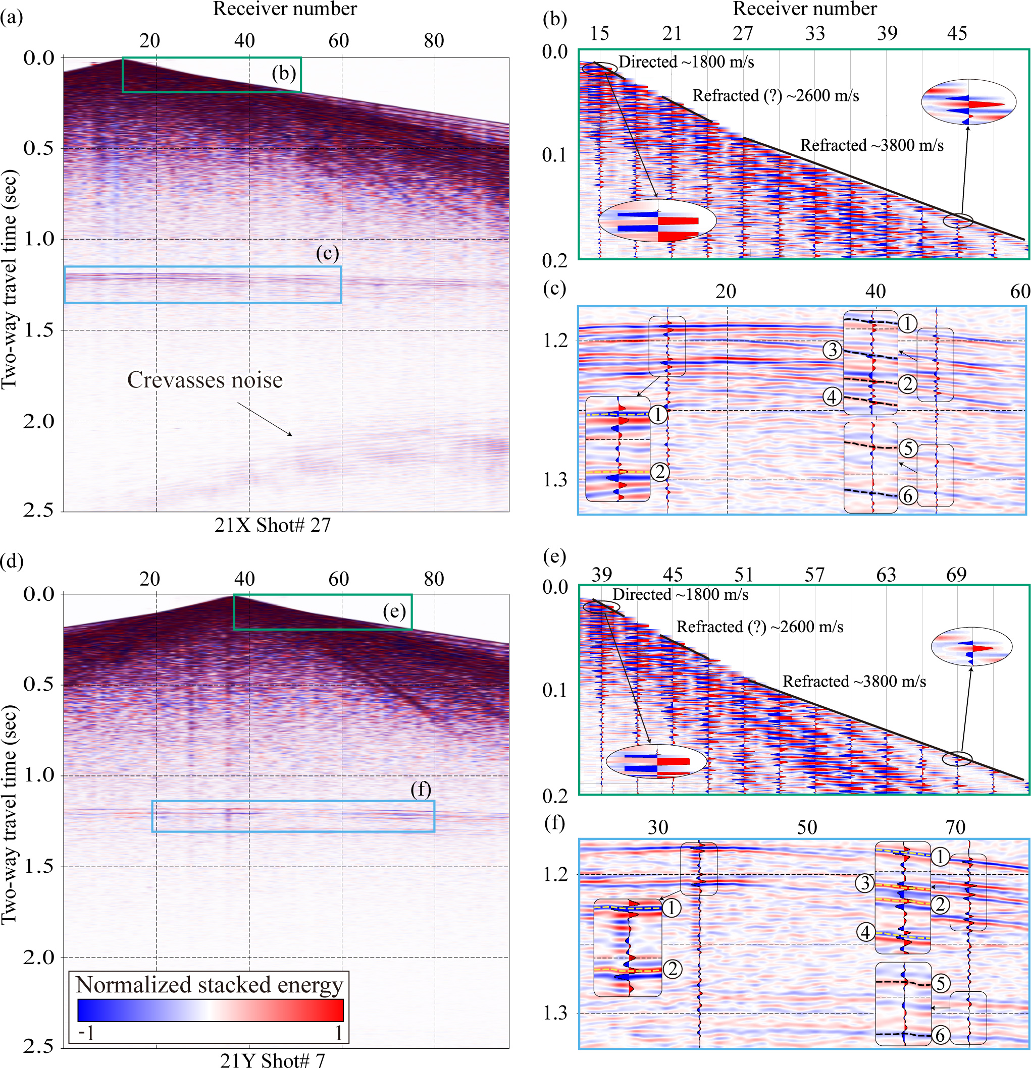 Figure 4Raw shot records from seismic lines 21X (a) and 21Y (d). Panels (b) and (e) are zoomed-in views of the early arrival window (0.0–0.2 s) from panels (a) and (d), respectively, used to calculate the apparent velocities of the direct and refracted waves. These panels highlight that the first arrivals of both the direct wave (clipped for display) and the refracted wave exhibit positive polarity. The direct wave, propagating through the upper firn layer (0–25 m depth), shows an apparent velocity of approximately 1800 m s−1, while the refracted wave in firn-ice transition has an apparent velocity of approximately 3800 m s−1. Panels (c) and (f) are zoomed-in views of the deeper arrivals (1.1–1.4 s) from panels (a) and (d), respectively. Reflections from the ice–water (1) interface exhibit negative polarity, whereas those from the water/sediment–bed (5) interface display positive polarity.