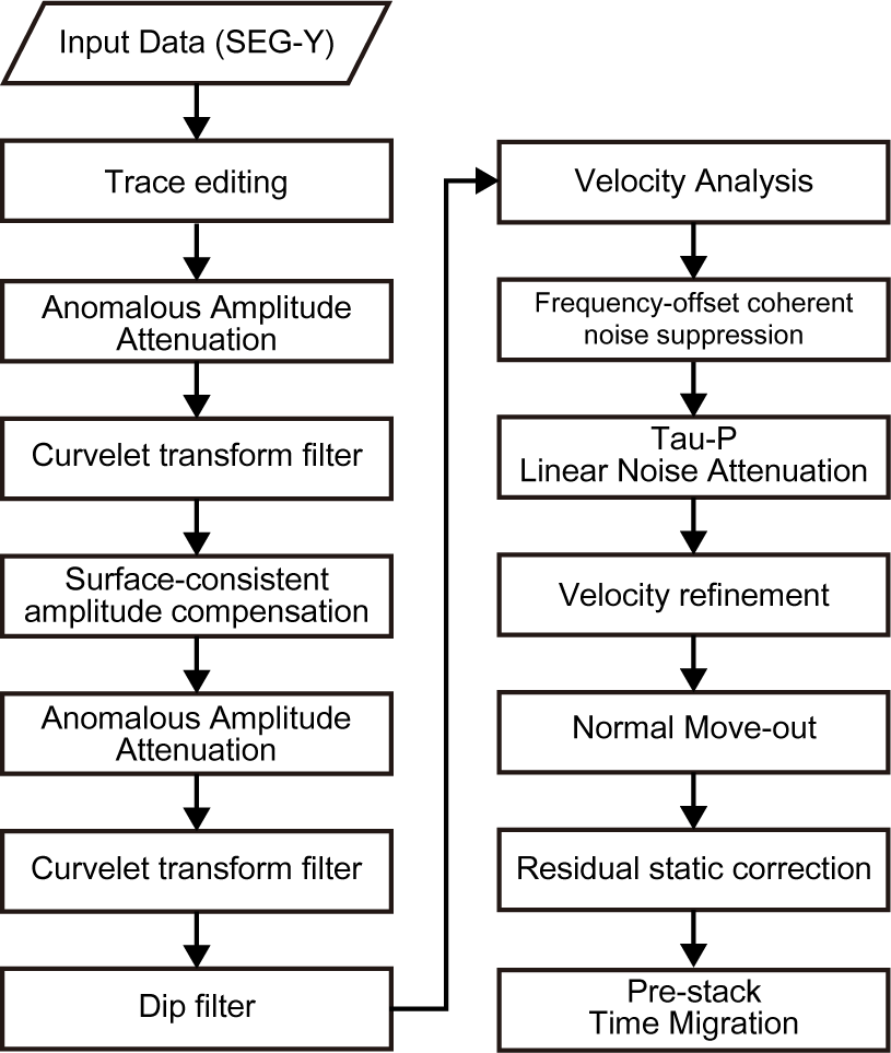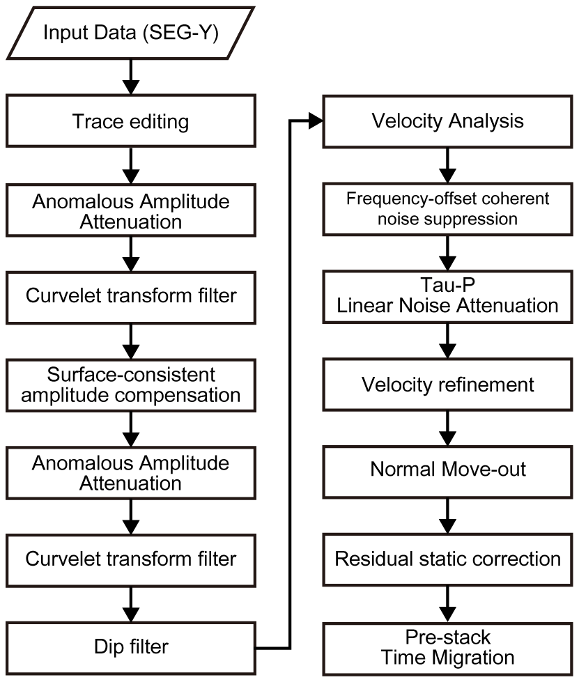 Figure 5Schematic of the seismic data processing workflow based on the Omega geophysical data processing platform (SLB), including noise attenuation, amplitude correction, velocity analysis, and prestack time migration.