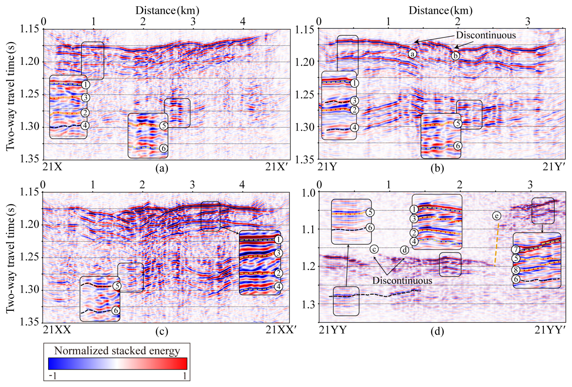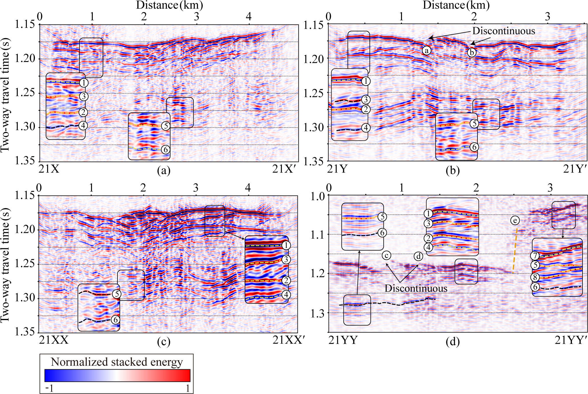 Figure 6 presents the PSTM results for the four seismic survey lines. On line 21X (Fig. 6a), a strong, laterally continuous reflection with reverse polarity is observed at 0.3–4.8 km along the profile, and the two-way travel time (TWT) is approximately 1.15–1.18 s. This reflection is interpreted as the glacier–lake interface (1). Approximately 25–30 ms below this horizon, a normal polarity reflection (2) appears, likely representing a ghost signal associated with the primary glacier–lake reflection. Between reflections (1) and (2), a weak normal polarity reflection (3), presumed to represent an interface, is observed. However, in some shot gathers, signal (3) appears with reverse polarity (Fig. 4c), leading to partial cancellation and ambiguity in layer interpretation. Approximately 25 ms later, an opposite polarity ghost reflection (4) follows. A deeper normal polarity reflection is observed within 1.9–3.1 km at TWTs of 1.25–1.27 s (5), which is interpreted as the bed interface. This is followed by a reverse polarity reflection 25–30 ms later (6), which is presumed to be the corresponding ghost of the bed interface.