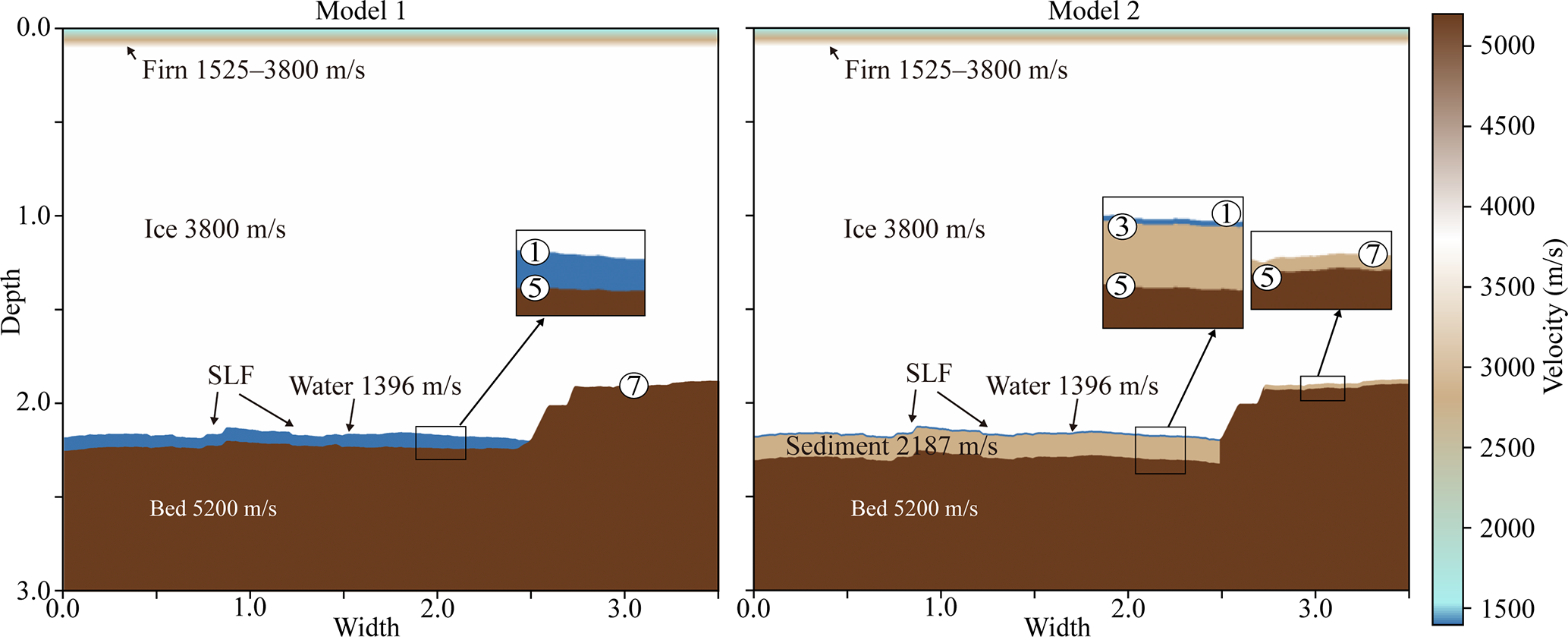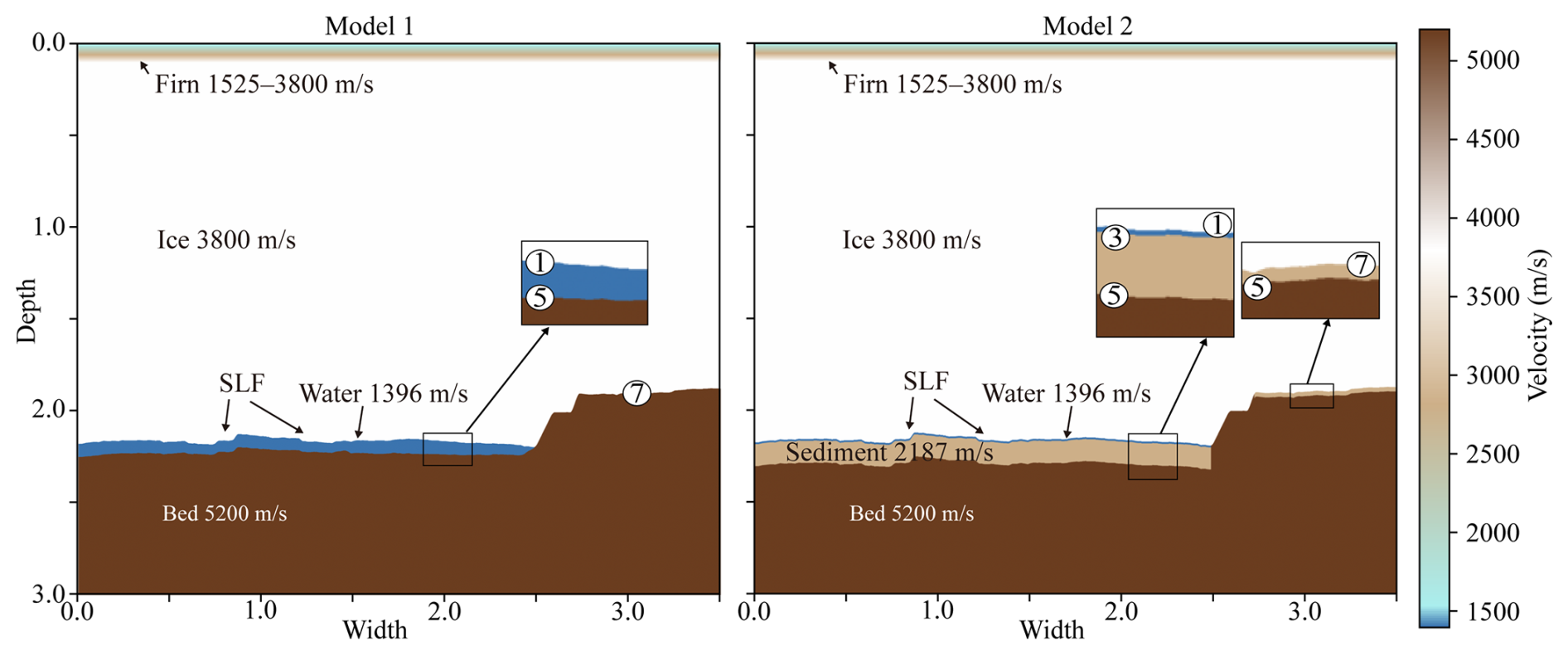 Figure 8P-wave velocity model used in forward modeling for line 21YY. The upper ∼100 m represents firn with velocities ranging from 1525–3800 m s−1 (Kirchner and Bentley, 1979; Picotti et al., 2015; Qin et al., 2024). The ice below this depth has a velocity of 3800 ± 5 m s−1 (Kohnen, 1974), and the subglacial water layer has a velocity of 1396 ± 2 m s−1 (Thoma et al., 2010; Tulaczyk et al., 2014). In Model 2, the velocity of 2817 m s−1 for the sediment layer was taken from the lower sediment layer model of Lake Vostock (Carcione and Gei, 2003).