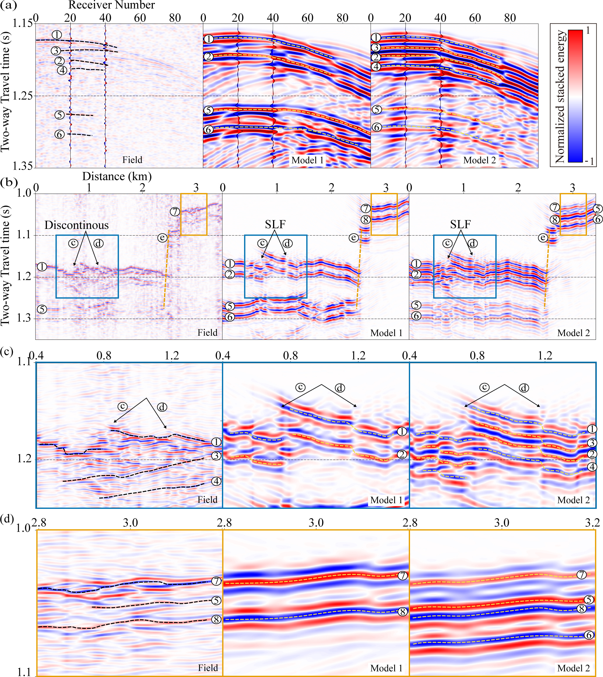 Figure 9Comparison of field seismic data and synthetic results from Model 1 and 2. (a) Shot gathers at the same location from the 21YY field data (left) and synthetic models (center: Model 1, right: Model 2). (b) Comparison of PSTM images from the 21YY line and the two synthetic models. (c) Enlarged views of discontinuous reflections. (d) Comparison of dipping bed reflections, showing shadow zones and steep basal topography.