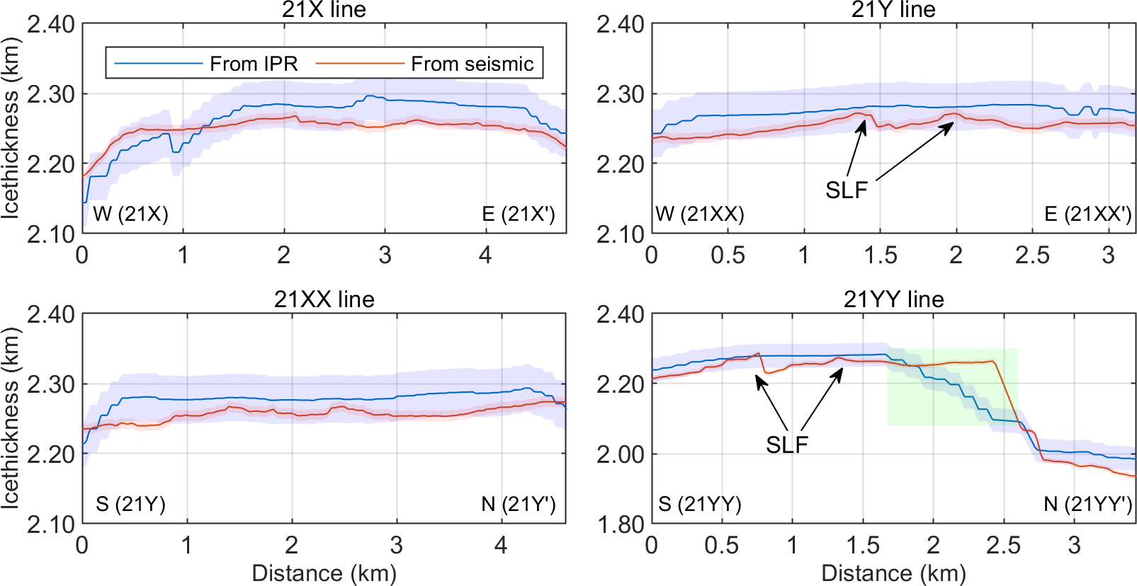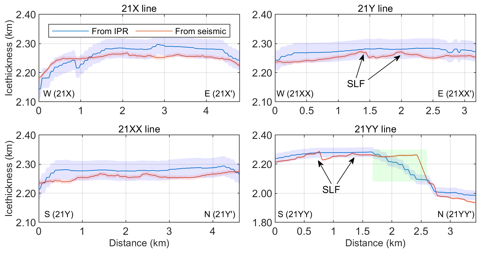 Figure 10A comparison of ice thickness estimates derived from seismic and kriging-interpolated IPR data (Ju et al., 2025) along the four seismic survey lines reveals high overall consistency between the two datasets, despite localized discrepancies. The light green shaded region in the 21YY line represents areas where interpolation contributes to the divergence between the two measurement approaches. The light blue envelope represents the uncertainty bounds associated with the IPR-derived estimates, while the light red envelope indicates uncertainty bounds for the seismic-derived estimates.