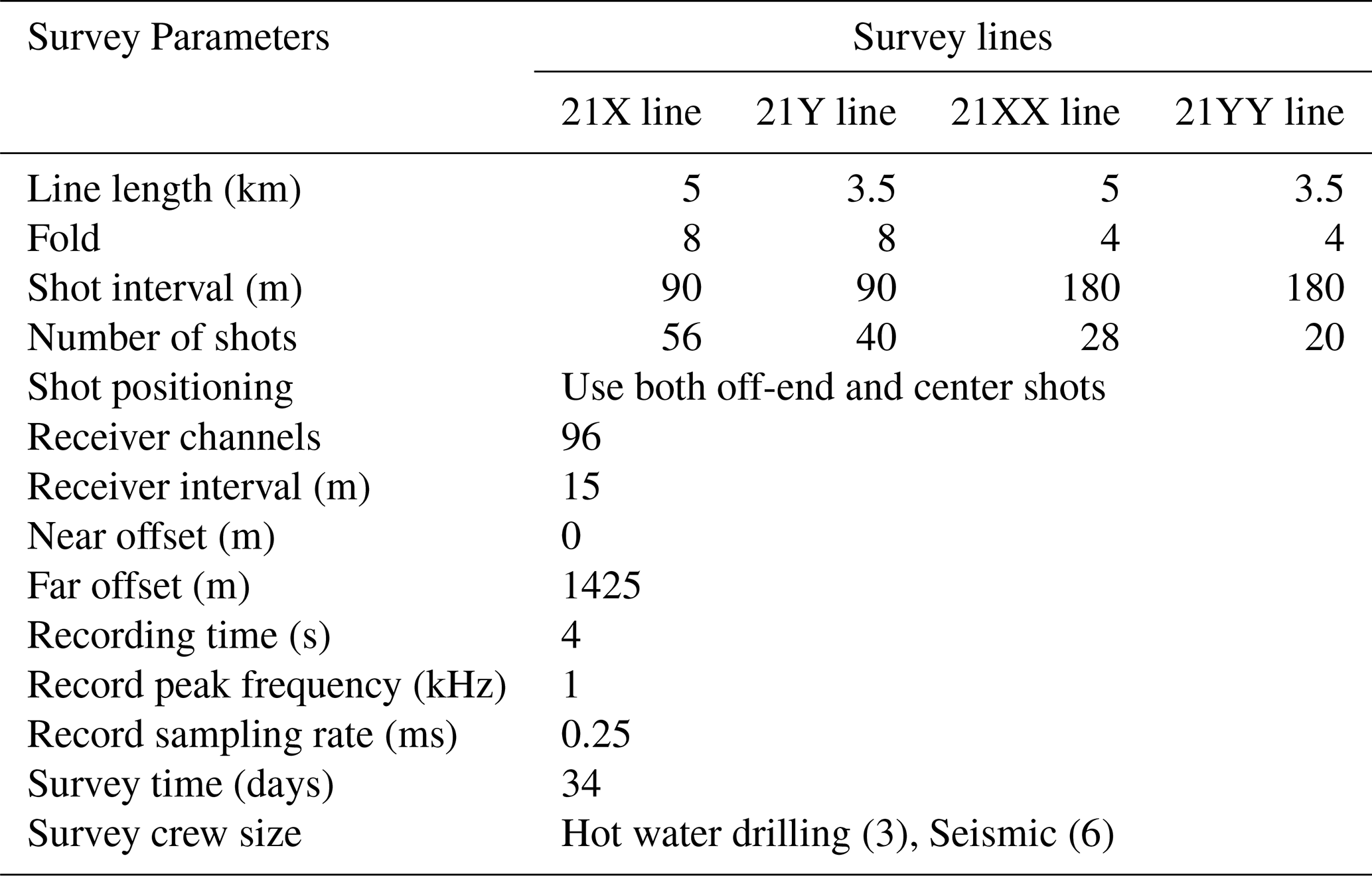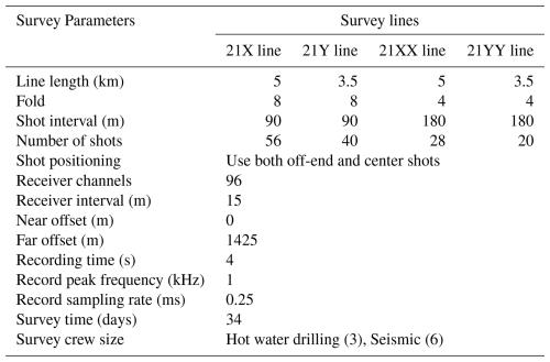 For the refined survey, seismic acquisition lines were planned using bed topography derived from the IPR and surface elevation data from satellite altimetry. A total of four seismic lines were acquired and designated 21X, 21Y, 21XX, and 21YY (Fig. 3). Lines 21X and 21XX, oriented approximately 60° relative to the ice flow direction, are situated at an average surface elevation of 1894 ± 13 m. Lines 21Y and 21YY, oriented approximately −30° in the ice flow direction, lie at an average elevation of 1887 ± 16 m. All lines traverse regions of minimal topographic relief, with average surface slopes of approximately 0.5°, indicating a relatively flat and stable glacier surface. The lengths of the 21X/21XX and 21Y/21YY lines are approximately 5 and 3.5 km, respectively. Seismic acquisition for lines 21X and 21Y was conducted using 8-fold coverage to increase the resolution, whereas lines 21XX and 21YY were acquired with 4-fold coverage due to time constraints during the survey. The additional acquisition parameters are summarized in Table 1.