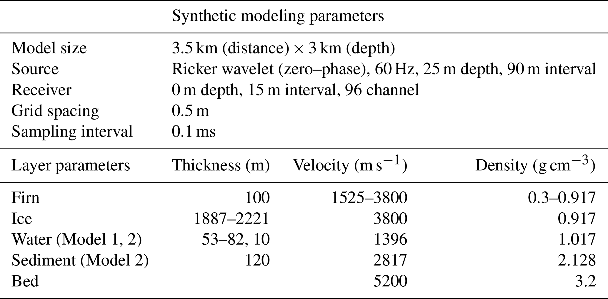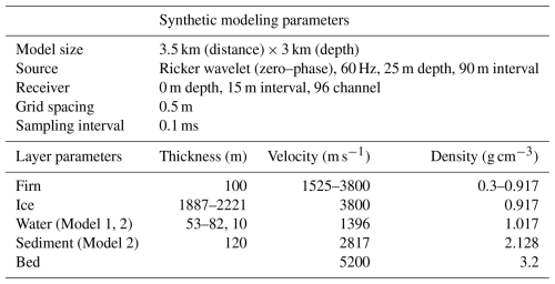 Interpreting field seismic data presents inherent challenges due to limited subsurface information, high levels of ambient noise, and signal attenuation. These issues are particularly pronounced at the SLD2 site, where the absence of borehole data introduces significant uncertainty and potential inaccuracies in depth estimations derived from PSTM sections. Such limitations may lead to misinterpretations of stratigraphic boundaries (Herron, 2000; Yilmaz, 2001). To address these challenges, this study developed a subsurface structural model and conducted a comparative analysis of synthetic seismograms generated from the model with observed field data. Focusing on the interpretation of basal reflections beneath the subglacial lake – excluding the glacier–lake interface (1) – two plausible structural models were proposed. Model 1 assumes the absence of a sedimentary layer, in which reflection (3) is not present, and reflection (5) represents the base of the subglacial lake. In contrast, Model 2 includes a sedimentary layer, where reflection (3) corresponds to the lake–sediment interface and reflection (5) indicates the sediment–bedrock interface (Fig. 8). The synthetic data were generated using a time-domain forward modeling approach based on the staggered grid finite difference method (Graves, 1996). The velocity model used in the simulation was constructed based on field velocity analysis and previously published data, and included stratigraphic units representing firn, glacial ice, subglacial water, sediment, and bedrock. Each layer was assigned appropriate P-wave velocities and density values. P-wave velocities in firn vary from 1525 to 3800 m s−1 because density increases with depth (Kirchner and Bentley, 1979; Picotti et al., 2015; Qin et al., 2024). Glacial ice has an average P-wave velocity of approximately 3800 ± 5 m s−1 at −2 ± 2 °C (Kohnen, 1974), while subglacial water has a velocity of approximately 1396 ± 2 m s−1 at −1.75 ± 0.25 °C, with a salinity less than 1 PSU (practical salinity units) (Thoma et al., 2010; Tulaczyk et al., 2014). The P-wave velocities of the sediment and bed were referenced from the Lake Vostok model value (Carcione and Gei, 2003). Forward modeling was then conducted using the Ricker wavelet, with acquisition parameters matching those used in the field survey (Table 3). We applied just the migration step in case of the synthetic dataset, as it is free of noise.