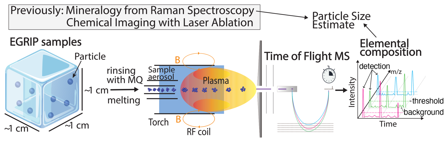 Figure 1Schematic overview of the workflow and set-up of SP ICP-TOFMS. Ice core samples are decontaminated with MQ water and melted. The sample aerosol is introduced via liquid nebulisation into the ICP for ionisation. Time of Flight measurements resolve the elemental composition of particles (not to scale) previously contained in the ice. Detection, threshold, and background are visualised. Mineralogy data from Raman spectroscopy enable the estimate of particle sizes. m/z: mass-to-charge ratio, B: magnetic field, RF: Radio Frequency, MS: Mass Spectrometer.