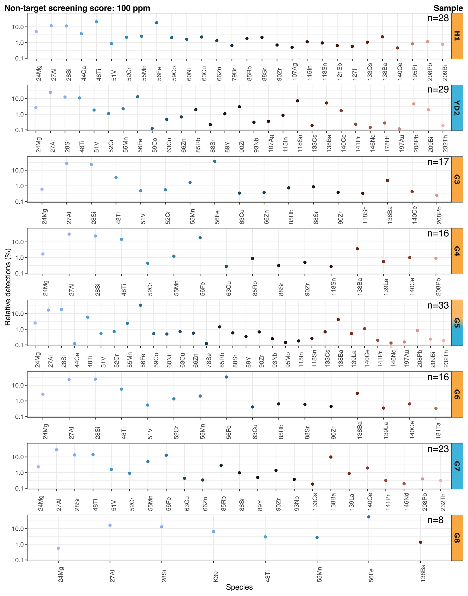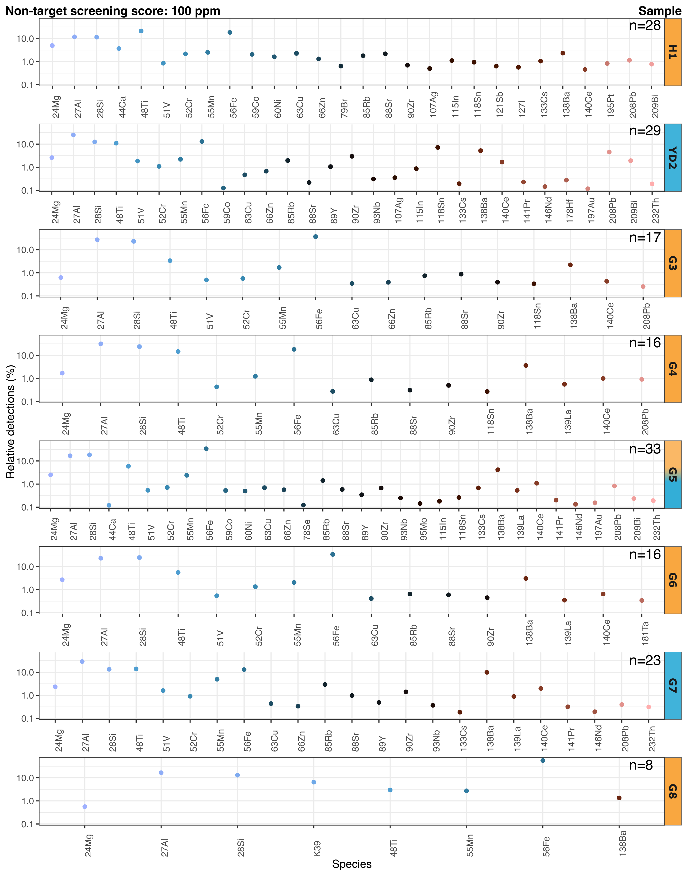 Figure 2Relative detections for chemical species above a screening score of 100 ppm detected with the automatic ionic background threshold; blank values were subtracted. The number of particulate elements in the sample is indicated by n. Each sample tag is filled with orange or blue for Holocene/interstadial and stadial samples, respectively. The debatable climate period of G5 is discussed in the text. Note the varying chemical species on the x-axis.
