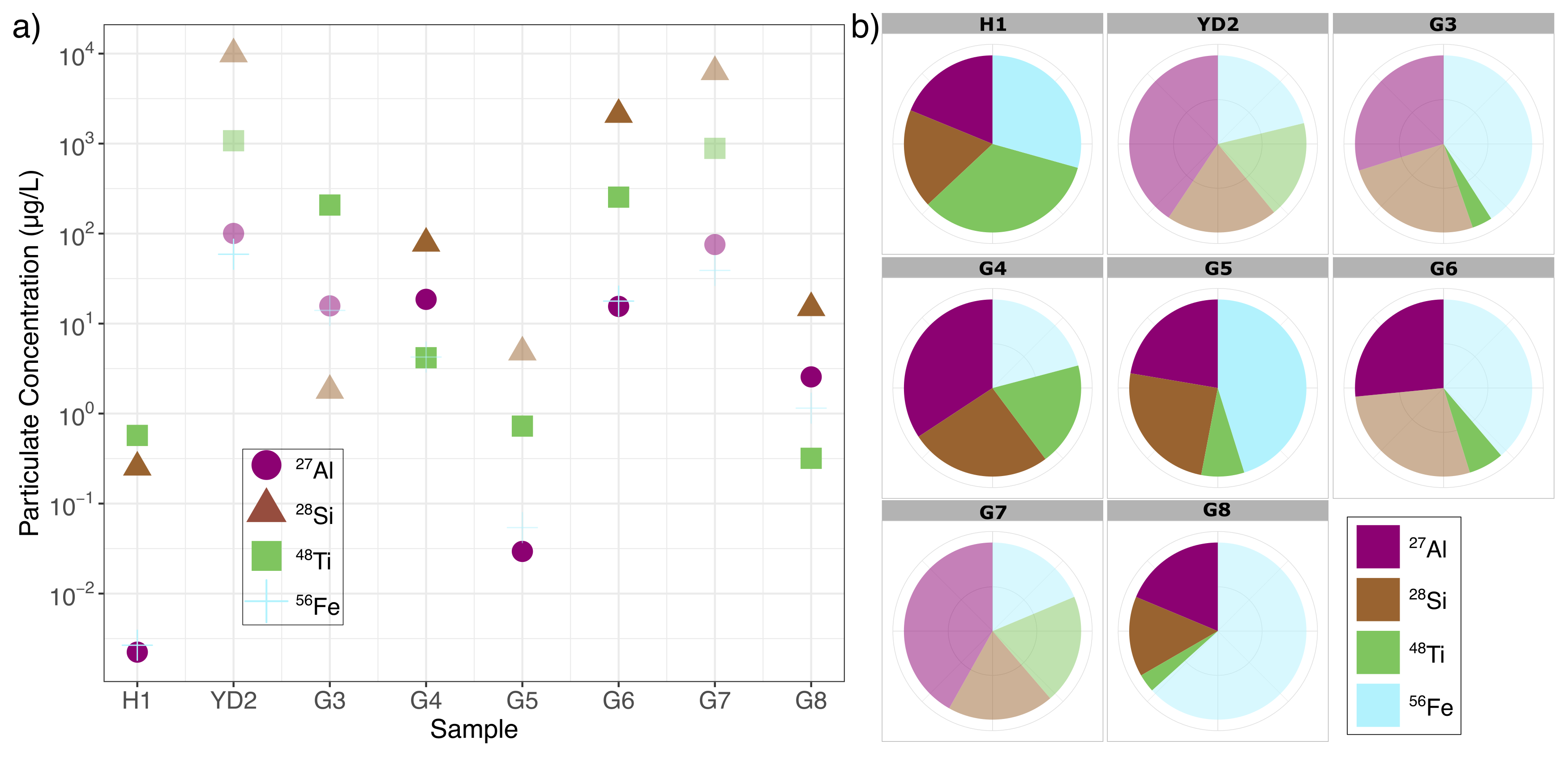 In the following we focus on the most abundant particulate elements 27Al, 28Si, 48Ti, and 56Fe. The highest particulate mass concentrations were found in YD2 and G7 (Fig. 3a). The concentrations in H1 were by far the lowest followed by G5. Usually, 28Si and 48Ti showed the highest concentration followed in decreasing order by 27Al and 56Fe. The relative data (Fig. 3b) show that 48Ti was a dominant detectable particulate element, by concentration, in the Holocene (H1), 27Al in the Younger Dryas (YD2), and 56Fe in the last glacial (G3, G5, G6, G8) with the exception of G4 and G7 where 27Al was more abundant. In G8, 56Fe represented almost two-thirds of the total relative particulate concentration share. 28Si has the most constant share throughout all samples, and its abundance fluctuates roughly between one-third and one-quarter. Detections above the event rate thresholds described in Sect. 2.6 were found in YD2 (27Al, 28Si, 48Ti, 56Fe), G3 (27Al, 28Si, 56Fe), G4 (56Fe), G6 (28Si, 56Fe), G7 (27Al, 28Si, 48Ti, 56Fe), and G8 (56Fe).