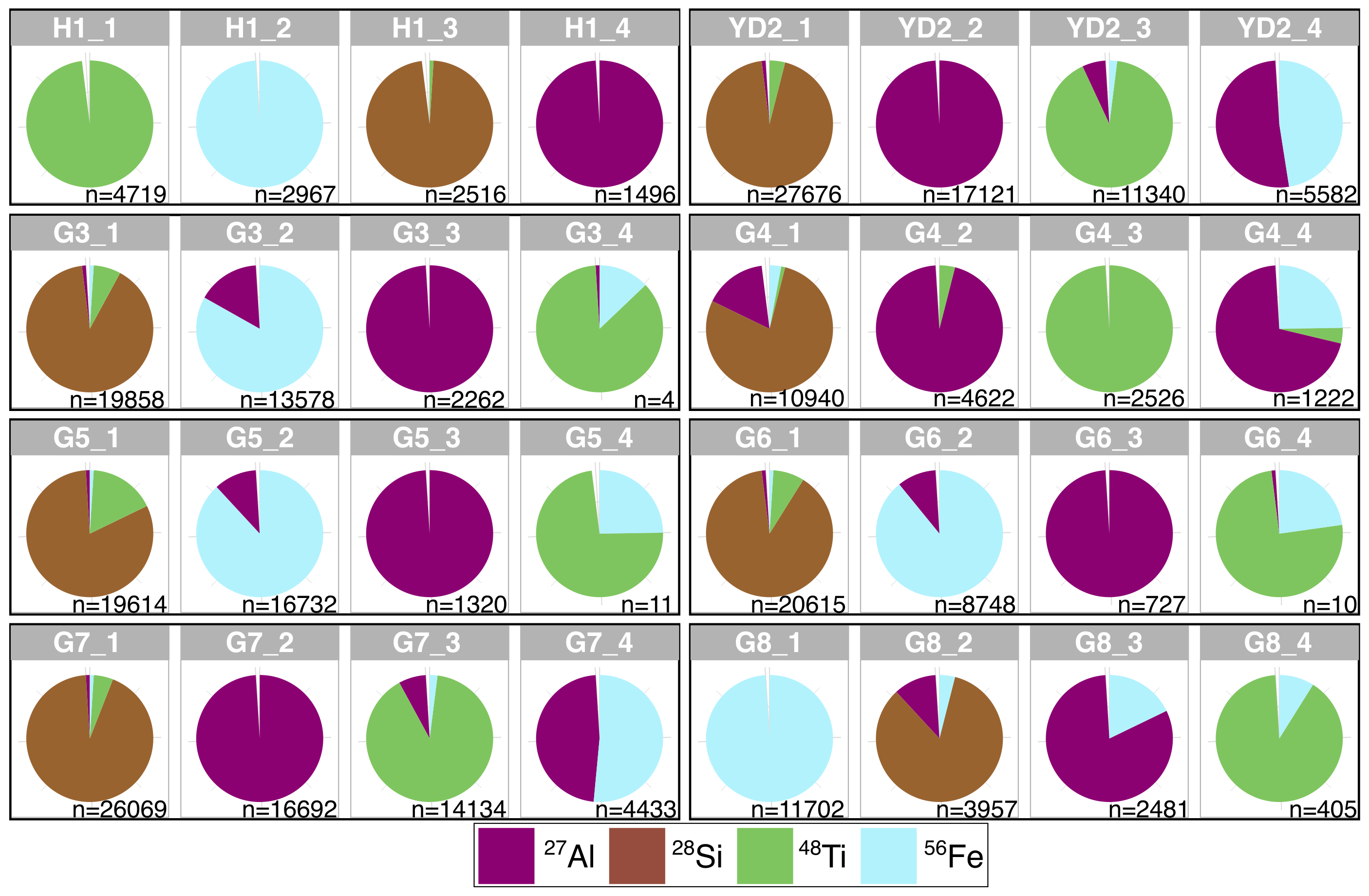 Figure 4The four most abundant elemental compositions (“clusters”) per SP by mass containing 27Al, 28Si, 48Ti, and 56Fe. The sub-plot title indicates the sample and the cluster in order of decreasing abundance; n indicates the number of particles with the displayed composition and the fraction in the chart represents the relative abundance of each element. Due to rounding, values do not always sum up to 100 %.