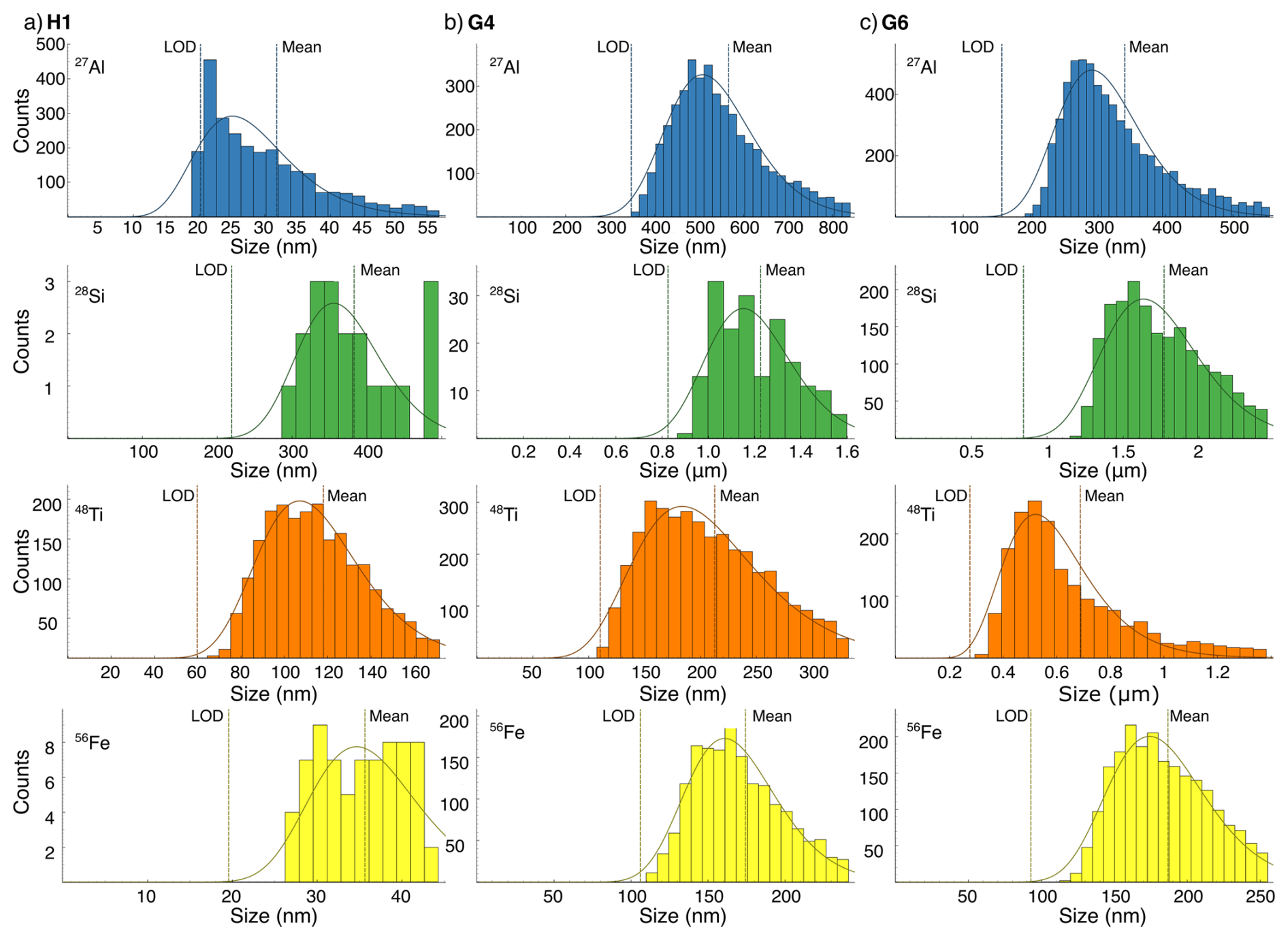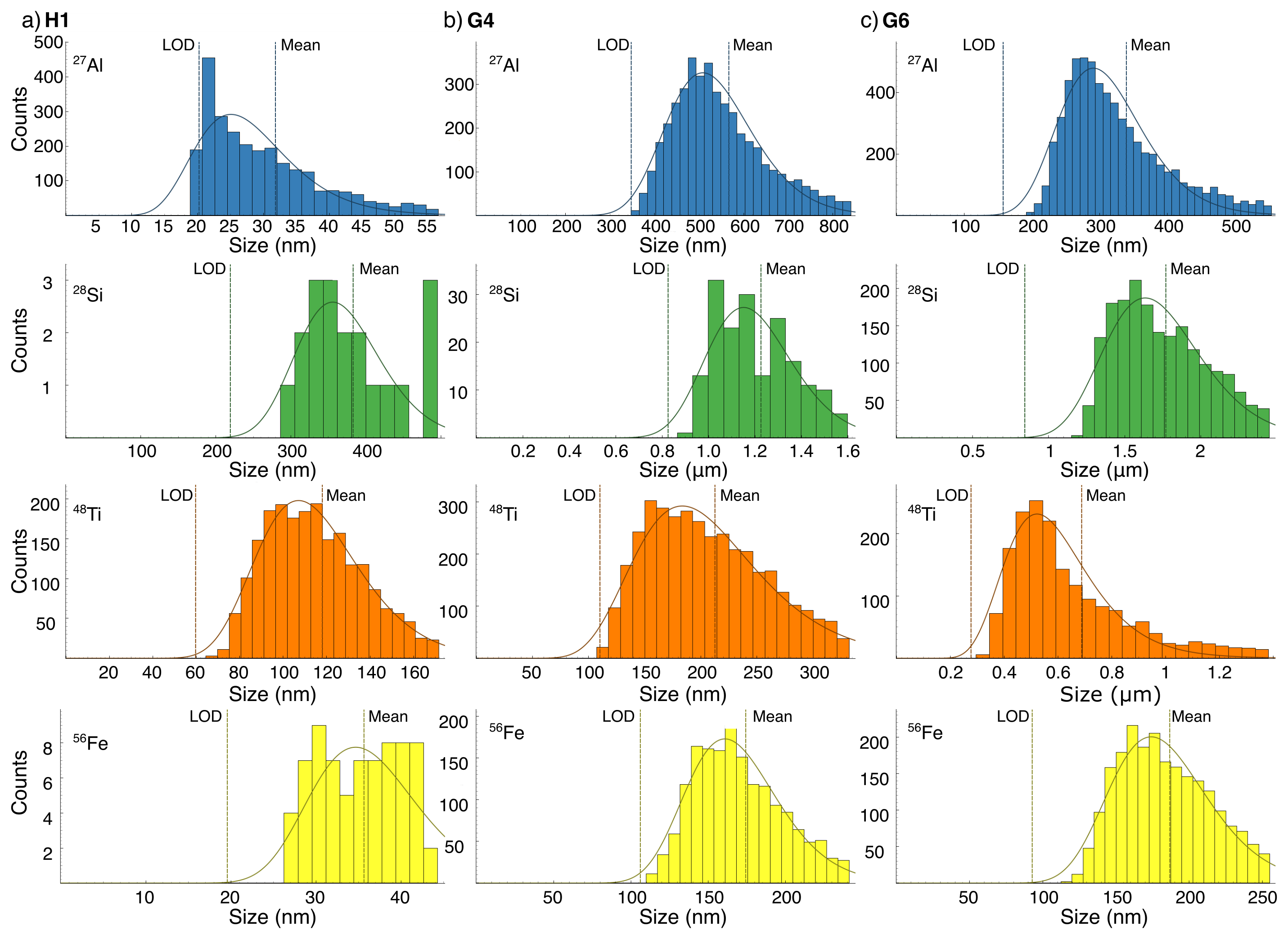 Figure 6Particle size distribution for assumed minerals based on Raman spectroscopy data (Sect. 2.7) for 27Al (blue), 28Si (green), 48Ti (orange), and 56Fe (yellow) in (a) H1, (b) G4, and (c) G6. The histogram displays estimated data based on measured SP data. The dashed line indicates the lognormal distribution and should be treated with caution for the area below the limit of detection (LOD), which varies depending on the sample's ionic background. Note µm on the x-axis for 28Si in G4 and 28Si and 48Ti in G6.