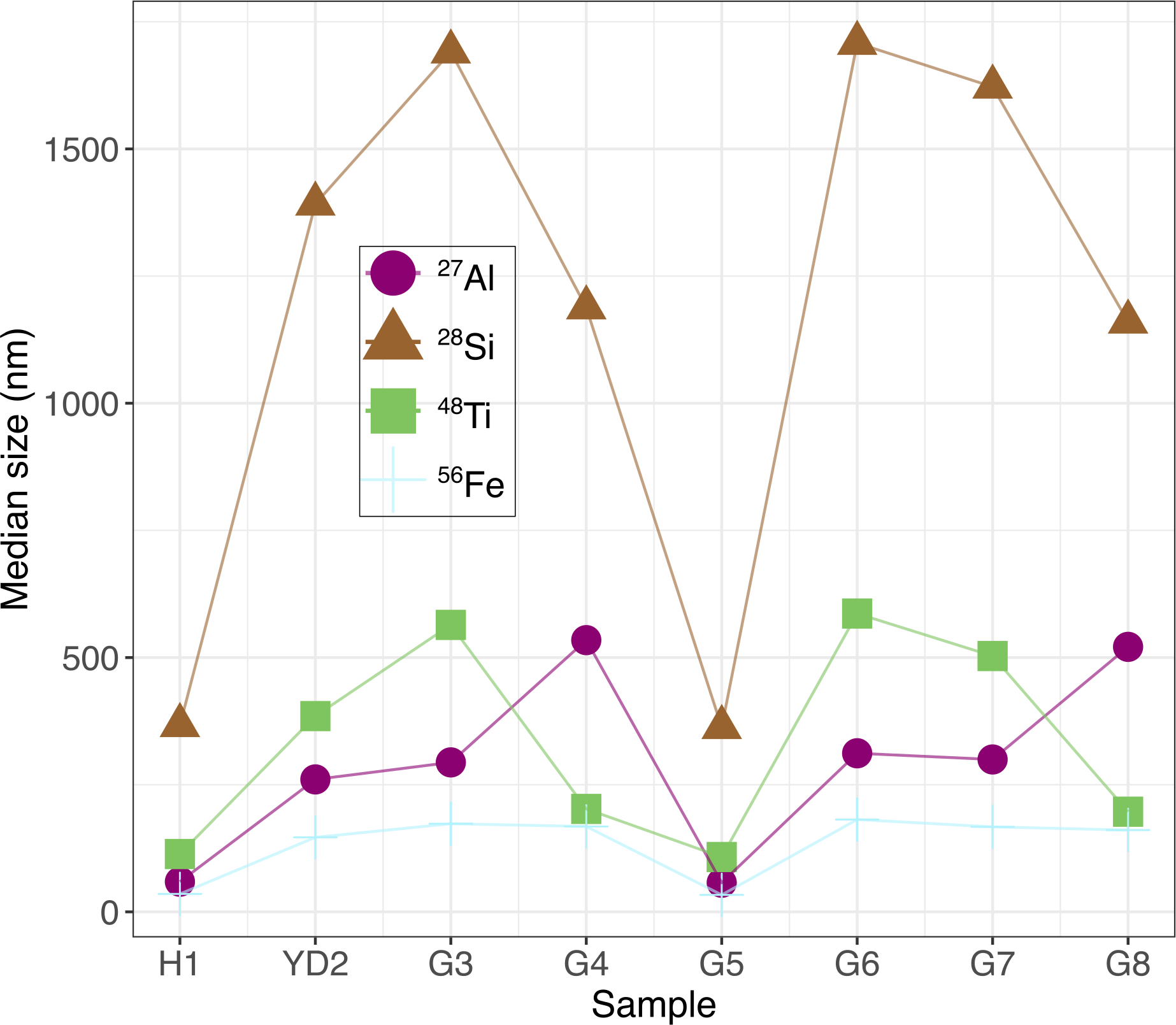 The estimated mean and median particle sizes (Figs. 5b and A1, respectively) show a wide range within samples and over the sampled spectrum. In the following comparisons and discussions, we will refer to mean values. Particles are comparably small in samples H1 (36–383 nm) and G5 (34–370 nm). 28Si-containing particles are the largest in six samples (H1, YD2, G3, G5, G6, G7) and range from 370 nm (G5) to 1770 nm (G6). It is worth noting that as particles increase in size, transport efficiency is reduced and data from large particles need to be interpreted with care (Lomax-Vogt et al.2025). 56Fe-bearing particles are always the smallest, ranging from 34 nm (G5) to 187 nm (G6). Median sizes are similar to the mean values (Fig. A1).