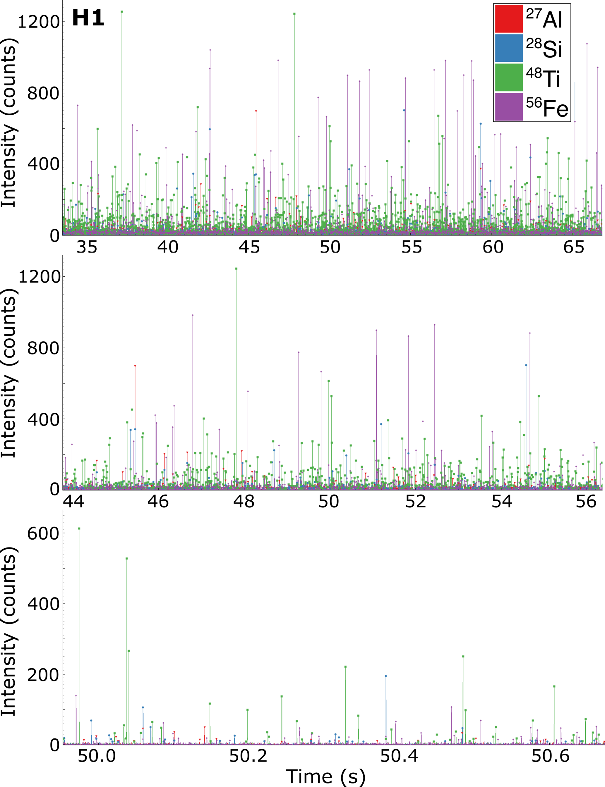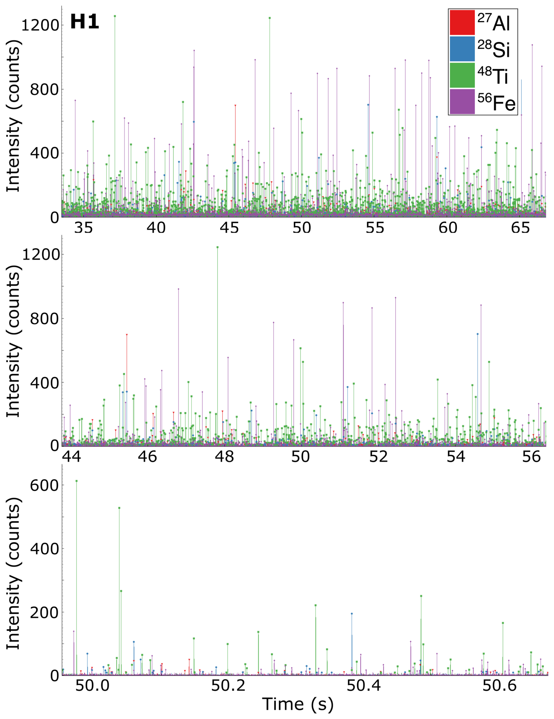 Figure A3Detected particle clusters in H1 after applying uniform thresholds. Only three different cluster, containing 27Al and 48Ti, were detected. Annotations as in Fig. 4.