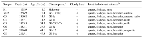 Table 1Analysed EGRIP samples and respective properties. Further information on the first two samples can be found in Stoll et al. (2022) and the remaining six in Stoll et al. (2023b). YD2 was investigated in detail by Bohleber et al. (2023).