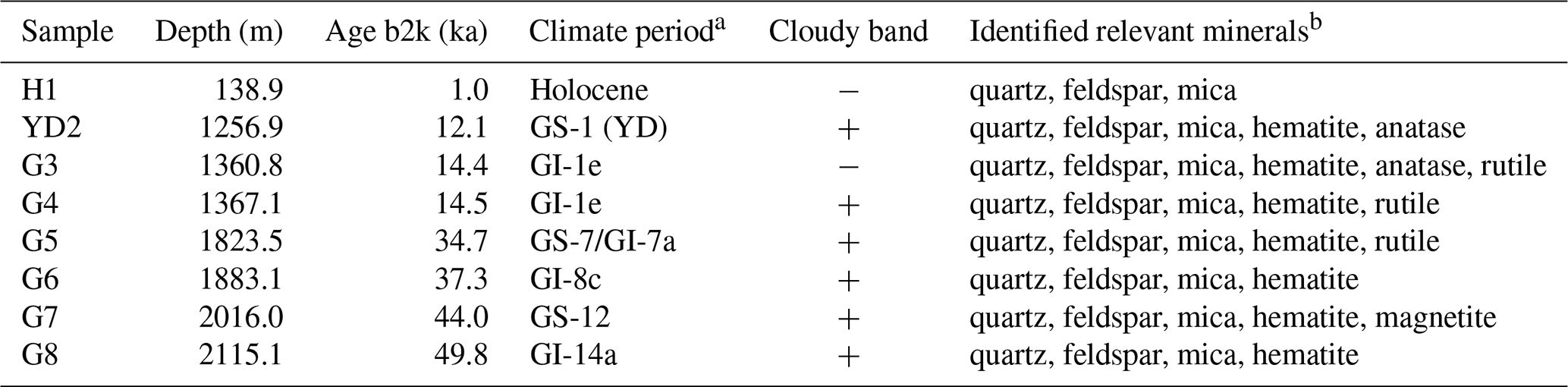 b2k: before 2000 CE after Stoll et al. (2025a), GS: Glacial stadial, GI: Glacial interstadial, YD: Younger Dryas, a after Rasmussen et al. (2013), b identified by Stoll et al. (2022) and Stoll et al. (2023b) and chosen for particle size estimates; does not represent all characterised minerals in these samples.