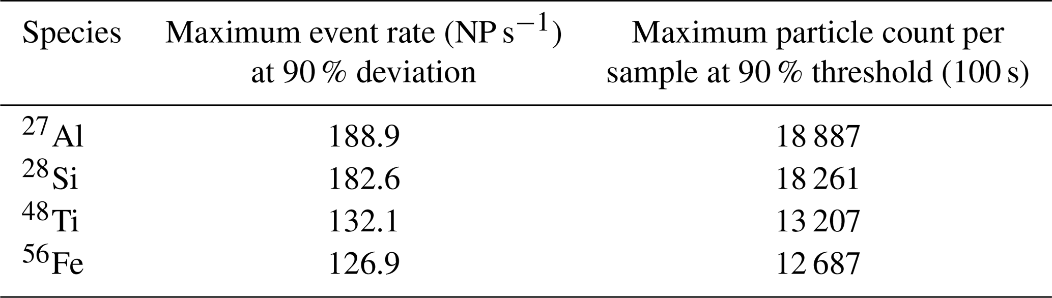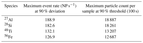 Table 2Thresholds for the maximum observable event rate (NP s−1) and the maximum observable absolute particle count per sample for the most abundant elements.