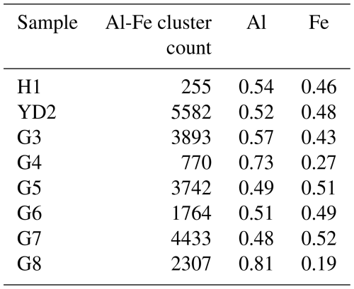 Our data show that the dust-rich cloudy band from the Younger Dryas (YD2) and the prominent cloudy band in G7 from the last glacial (GS-12) have by far the highest particle concentrations (Fig. 3a). The cluster analysis (Fig. 4) shows that particle clusters in both samples are very similar in composition. In both samples, 27Al is the dominant element (Fig. 3b) followed by 56Fe, 28Si, and 48Ti. This indicates that the analysed particles originate from similar source regions and were transported under comparable climate conditions. As discussed by Stoll et al. (2021a, 2023b); Bohleber et al. (2023), these cloudy bands are stratigraphic features indicating high insoluble particle concentrations partially from dry deposition events. These bands dominate the ice stratigraphy below the bubble-hydrate transition helping to assess the macroscale palaeoclimate record integrity and are potentially areas of enhanced diffusion and microstructural ice rheology differences (Faria et al.2010). Unfortunately, there is no EGRIP chemical data, e.g. from CFA, from the depths analysed in this study. For a comparison and further in-depth characterisations, more data are thus needed.