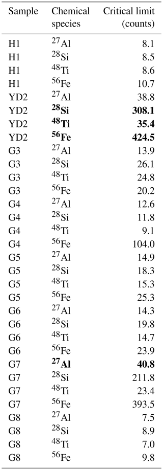 Table A1Critical limit thresholds for all samples and elements. Bold numbers refers to the highest ionic background threshold for the respective element throughout all samples, which was applied to all elements for the size estimate.