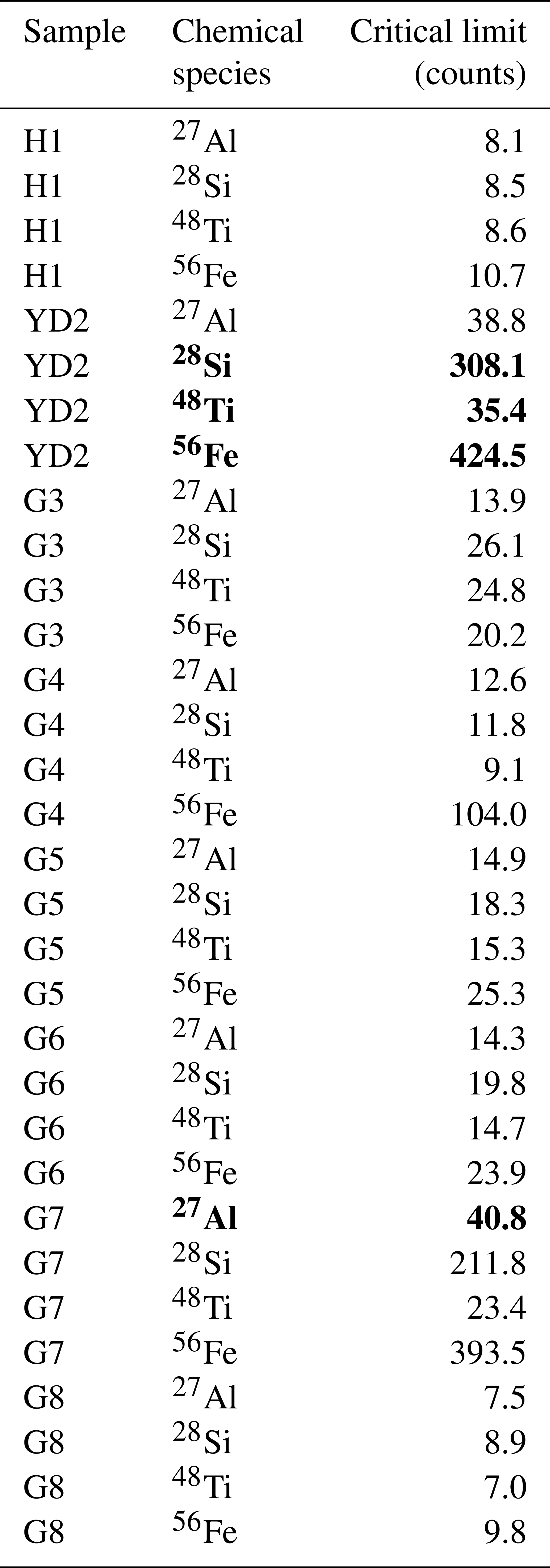 Across all samples, we selected the highest ionic background to make the detection of (large) particles comparable (see Sect. 2.4). Detections above the event rate thresholds (Sect. 2.6) were only reached in YD2 (27Al, 28Si, 48Ti, 56Fe) and G7 (27Al, 28Si, 48Ti, 56Fe). While this approach enables the (conservative) comparison of particle size and number, it prevents the analysis of small, e.g. nanometre-sized, particles. Therefore, the following comparisons are merely qualitative within the size window stipulated.
