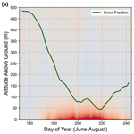Analysis of the UAV profiles (Sect. 3.1) indicates that tundra and glacier surfaces exert the strongest influence on the near-surface temperature structure. Therefore, we calculated the daily mean temperature differences of air below 500 m over tundra and glacier ice surfaces, together with the mean snow fraction from 1991 to 2024 (Fig. 3a). Within JJA, the average snow fraction is nearly complete in early June (0.96 on day of year (DOY) 155) and reduces to approximately snow-free conditions by early August (0.1 on DOY 220). Over this period, the temperature differences near the surface increase at the two locations, with higher air temperatures above tundra compared to ice within atmospheric layers up to 100 m a.g.l. The largest temperature differences occur closest to the surface, exceeding 2 °C. As the snow fraction increases again after DOY 220, the air temperature differences above tundra and ice decrease.