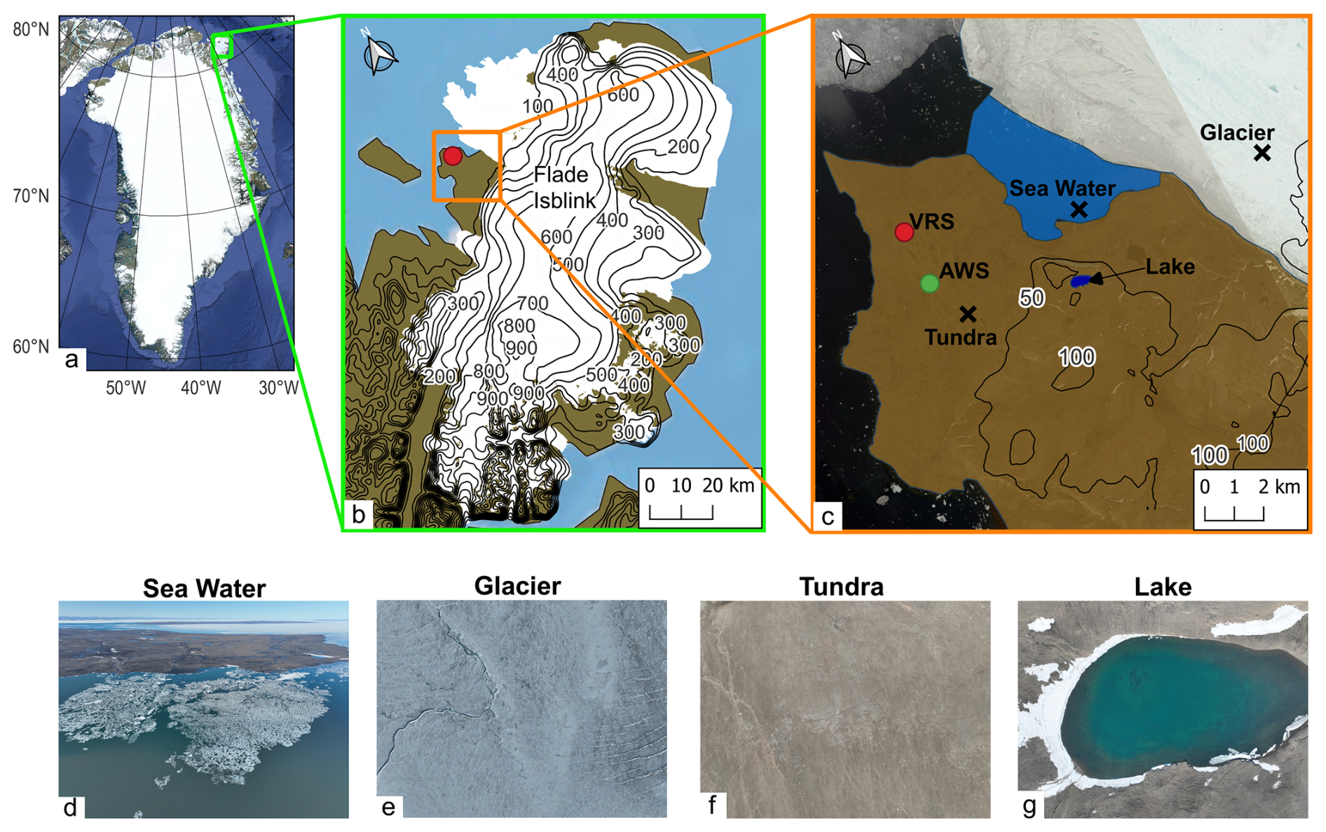 Figure 1Overview of the study area in Northeast Greenland (a–c). The red dot in panels (b) and (c) marks the location of VRS, while the green dot in panel (c) indicates the Automatic Weather Station (AWS) at the atmospheric observatory house of VRS. Contour lines in (b) and (c) indicate topographic elevation in m. The blue area in panel (c) outlines the approximate extent of sea ice-free conditions during the field campaign. Panels (d)–(g) depict photos of typical different surface cover types during summer. The outlines of FIIC are taken from RGI Consortium (2023). The base layers in panel (a) and (c) are from Landsat satellite imagery provided by Google et al. (2026) and in panel (b) adapted from QGreenland v3.0.0. (Moon et al., 2023). Figures were created in QGIS https://www.qgis.org/de/site/ (last access: 20 January 2026).